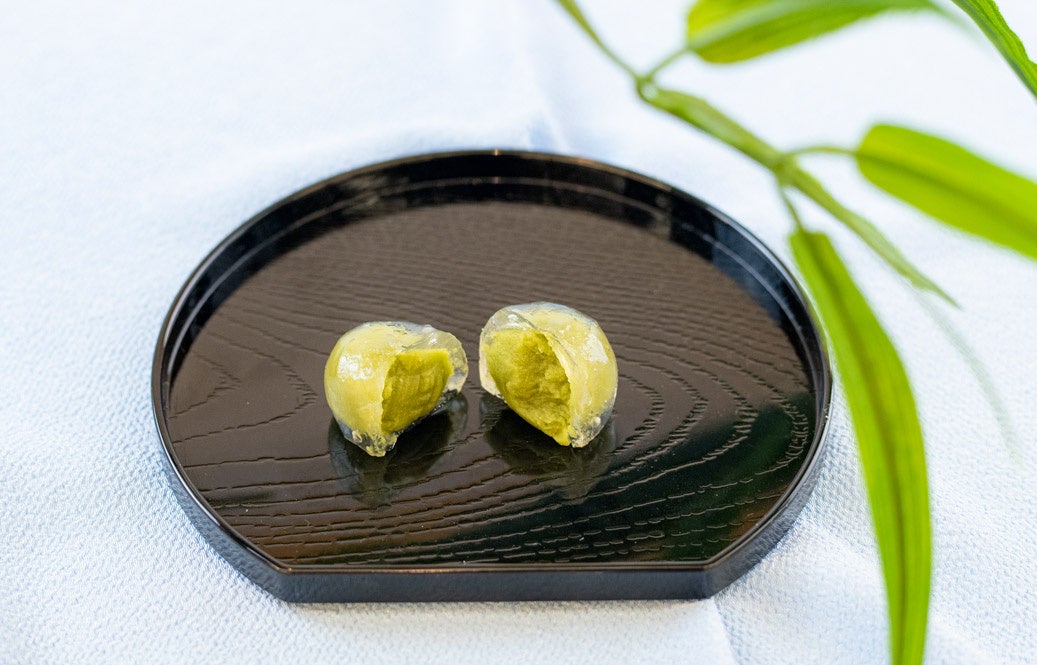 つるんとした葛餅は、舌触り良く目にも涼やかで、夏にピッタリ!夏のカラダの熱を下げるには、苦味が効くと言われますが、ほろ苦い抹茶味でご用意しました。