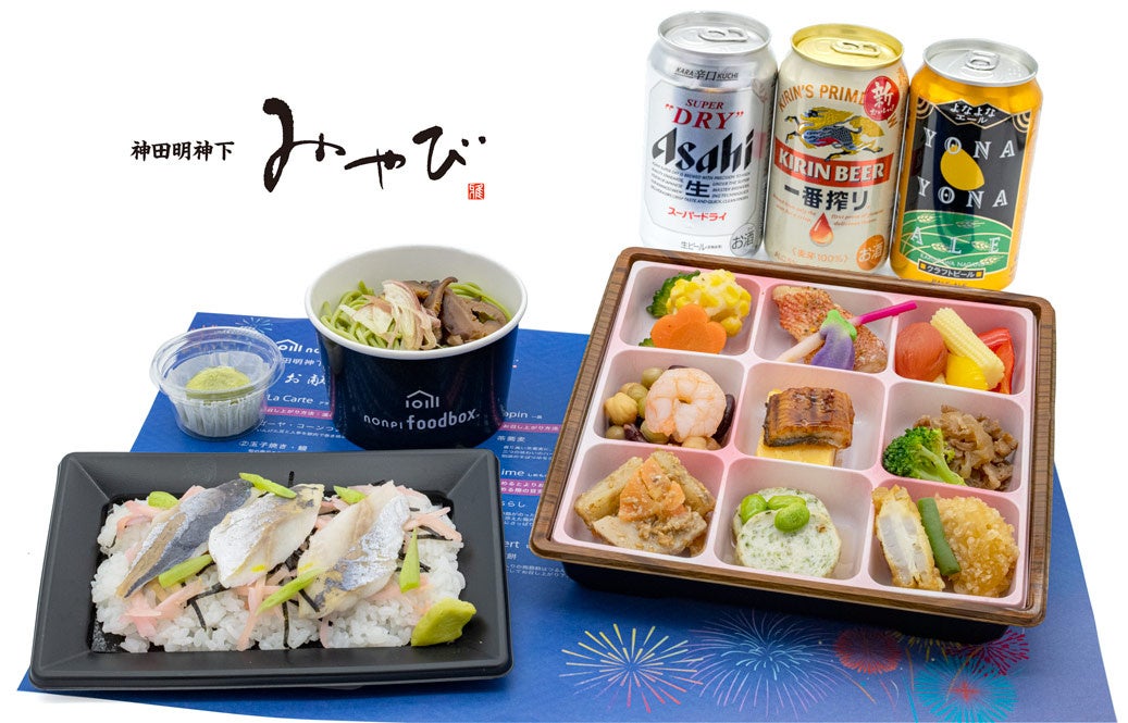 nonpi foodbox®の人気シリーズ高級和食の老舗「神田明神下 みやび」とのコラボレーション商品から、爽やかな初夏を感じる彩りの良い食材を使用した、夏季限定のプランをご用意しました。夏の日差しのようにきらめく色彩豊かな和風アラカルトやごはんもの、甘味とドリンクをセットにして日本全国へお届けいたします。