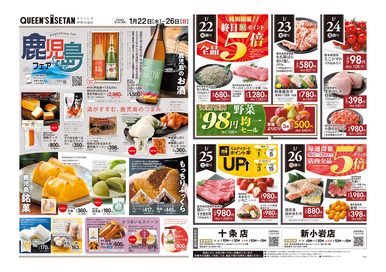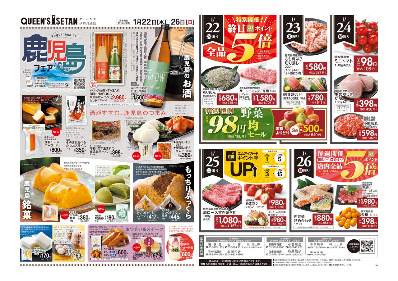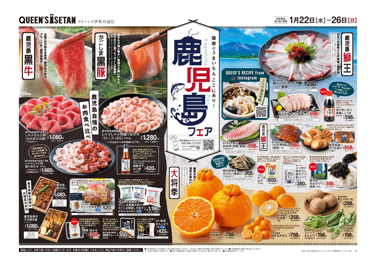 三越伊勢丹のグループ会社で、首都圏を中心に19店舗のスーパーマーケット(クイーンズ伊勢丹)を運営する株式会社エムアイフードスタイル(本社:東京都新宿区、代表取締役社長:雨宮 隆一)は、1月22日(水)~1月26日(日)までの期間限定で、「鹿児島フェア」を開催いたします。