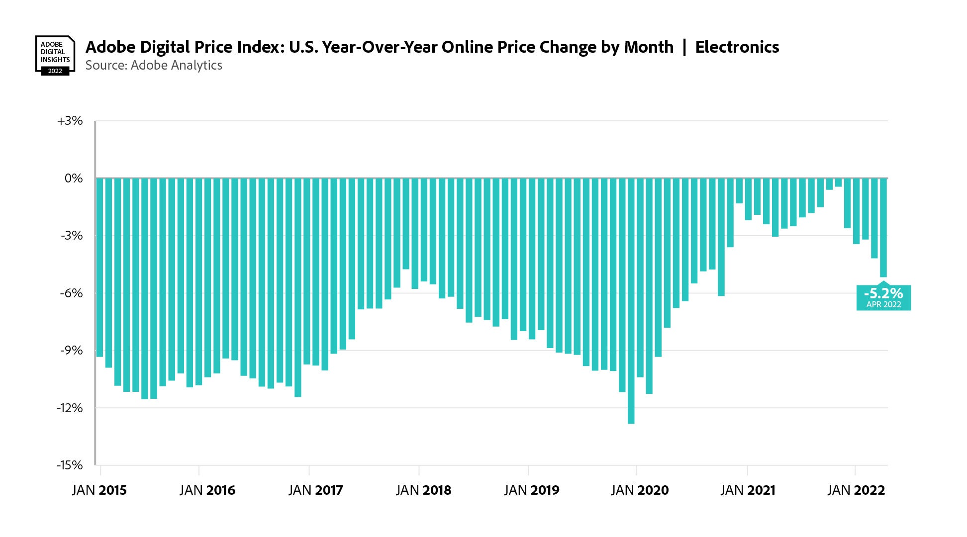 Adobe(Nasdaq: ADBE)(本社:米国カリフォルニア州サンノゼ、以下アドビ)は本日、Adobe Analytics( https://business.adobe.com/jp/products/analytics/adobe-analytics.html )で分析した米国における最新(2022年4月時点)の「Adobe Digital Price Index(DPI)( https://business.adobe.com/jp/resources/digital-price-index.html )」を発表しました。これによると、2022年4月のオンライン価格は前年同月比2.9%増で、過去最高だった3月の同3.6%増から減少、前月比では0.5%減となりました。前年同月比でのオンラインインフレはこれで23か月連続となりましたが、4月の結果はオンラインの価格上昇が鈍化する初期の兆候を示しています。また、DPIが追跡しているカテゴリーの半数以上(18カテゴリー中10カテゴリー)が前月比で価格下落を示しています。