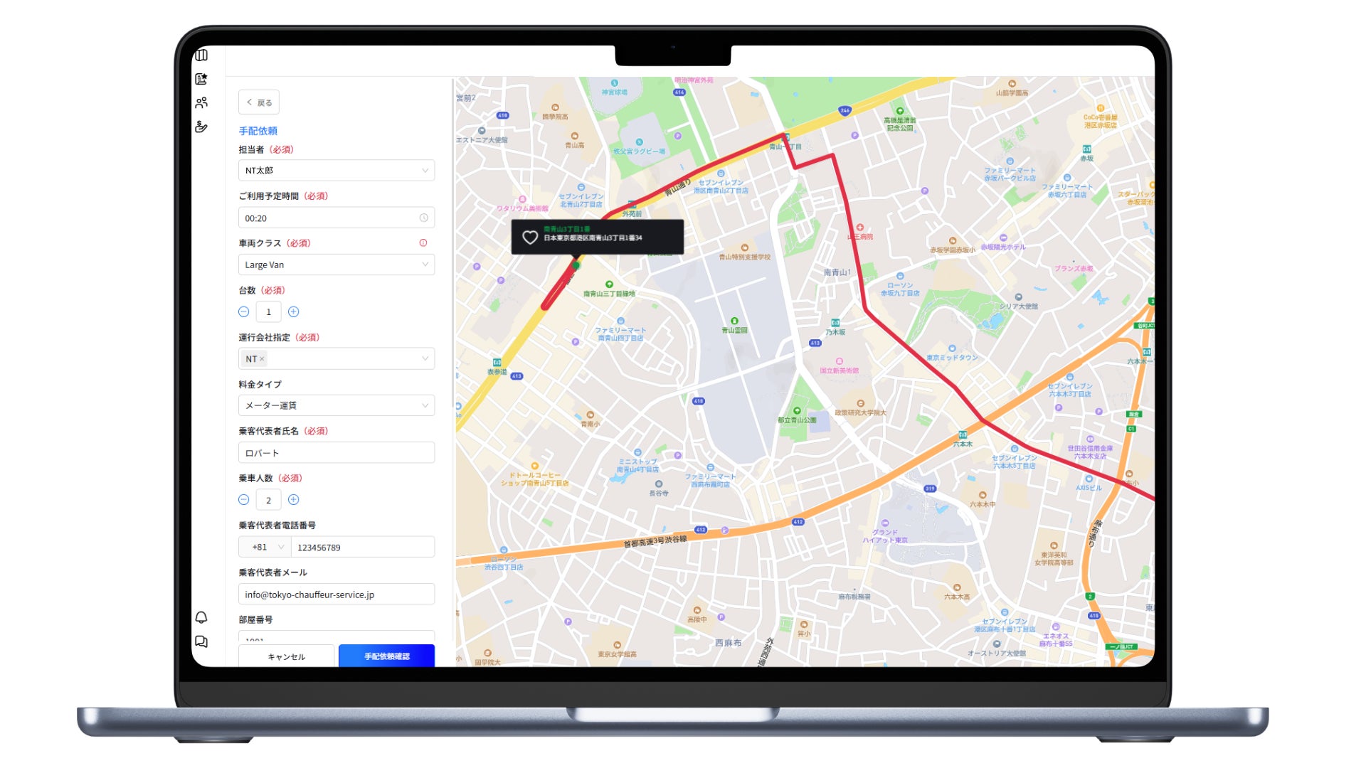 ホテル事業者は、配車依頼〜文書管理(発注書など)までオンライン上で手続きや処理を完結することができ、「TOKYO CHAUFFEUR SERVICE」専用のシステムでステータスも含め配車情報の一元管理が可能です。配車注文時には、事前に必要な顧客情報(氏名・乗車人数・荷物の個数・目的地・言語・指定の車両クラス・その他チャイルドシートや車椅子の利用有無、観光希望など)を入力していただくことで、ミスコミュニケーションを防ぎ、顧客ニーズに沿ったサービスを提供することができます。また、車両の現在地の把握や、ホテル事業者とドライバー・ハイヤー運行担当者がコミュニケーションを図るチャット機能もご用意しています。