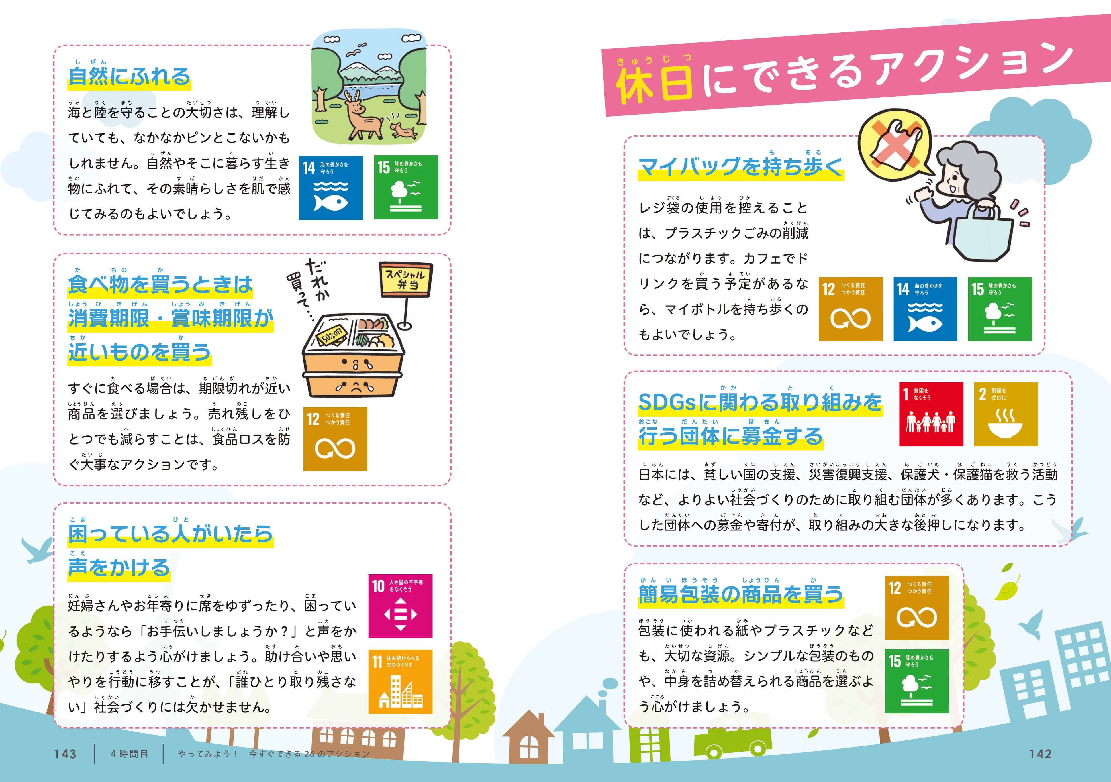 「〜を解決するためにはどんな方法があるかな?」「もし◯◯になったらあなたはどうする?」など議論と思考を促すコメントも用意。SDGsを自分ごととして捉えることができます。