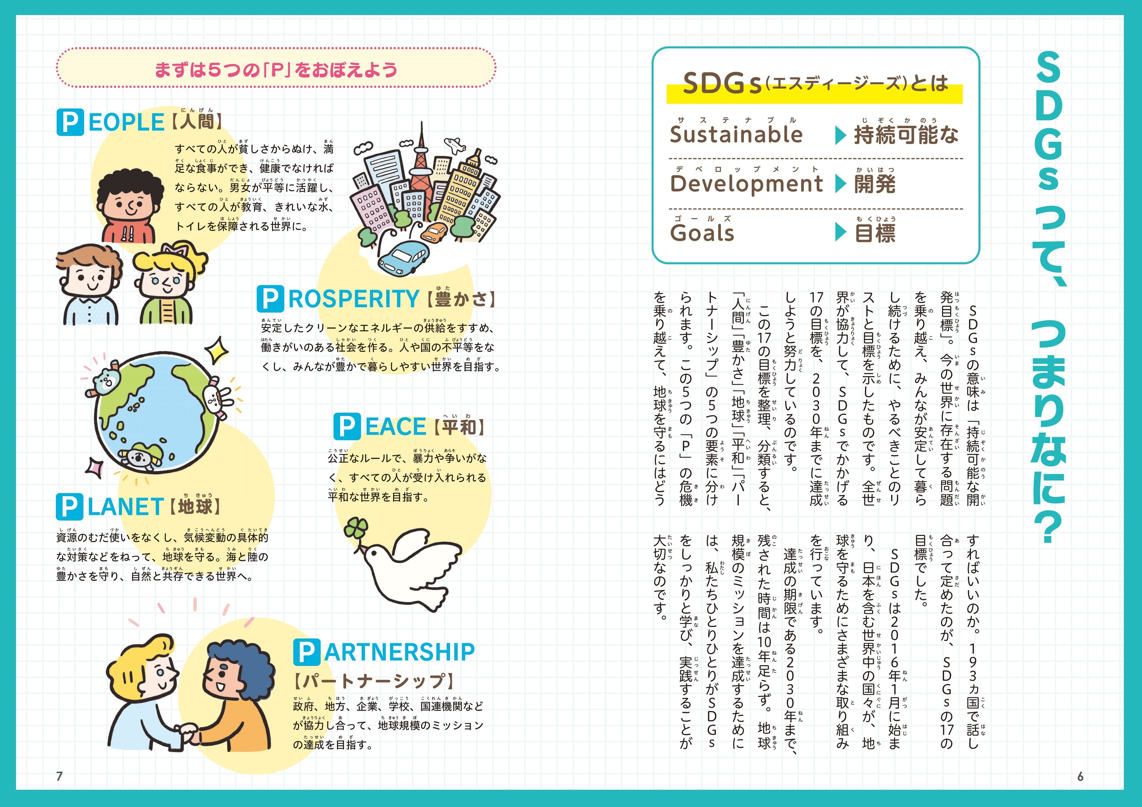 さらに、「SDGsがわかりやすくなる5つのP」、「SDGs=環境問題だけじゃない!経済・社会・環境の3つが大切」など、あまり語られていない、SDGsの根本理解をたすける解説も準備。