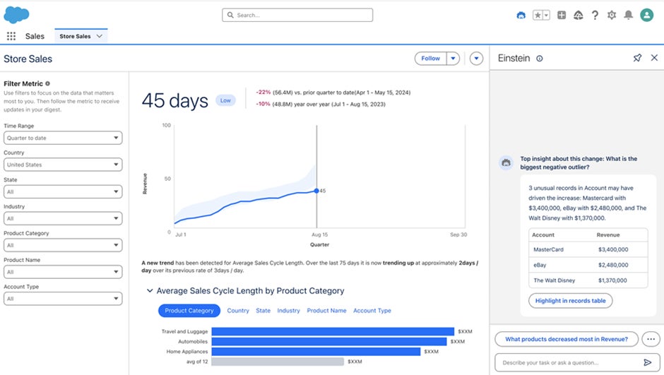 ・最新の分析のための自律型および支援型エージェントが、Tableauの主要ソリューションであるTableau Agent (旧Einstein Copilot for Tableau)やPulseで提供可能になります。Pulse はAI を使用して重要なメトリクスを自律的に特定し、Slack、メール、Salesforceのクラウド製品など、ユーザーが利用するアプリケーション内で、コンテキストに沿ったメトリクスを表示します。Tableau Agentと Pulse により、ユーザーは支援機能を使用して自然言語でデータに質問することができ、視覚的かつ説明的な回答がアプリケーション内のアクションに変換されます。分析担当者は、何百もの構築済みAPIエンドポイントでアクションを推進する組み込みのワークフローを強化することができます。Salesforceのクラウド製品と組み合わせると、Tableau Einstein はすぐに使えるメトリクス、予測 AI、AIエージェントを備え、将来に向けた傾向を予測するだけでなく、その予測に基づいて実行可能なステップを提案します。