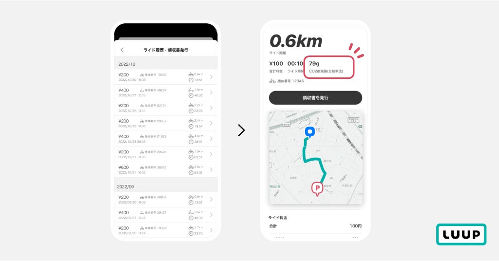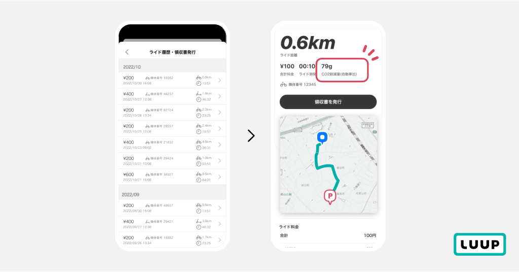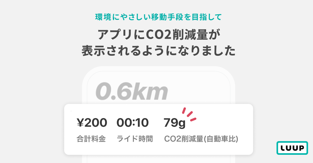 LUUPの電動マイクロモビリティが走行時に使用する電力は、実質的に全て再生可能エネルギー由来であり、LUUPの利用では走行に伴ってCO2を含む温室効果ガス(GHG)は排出されないこととなります。Luupでは、人々が既存の交通手段からLUUPに乗り換えることで削減されるCO2の排出量は月間50トン以上と試算しています(※)。今回の実装により、ユーザーが各ライドで実際にどの程度のCO2排出量の削減に貢献できたかを可視化することで、ユーザーの皆様の環境意識の高まりにも応えてまいります。