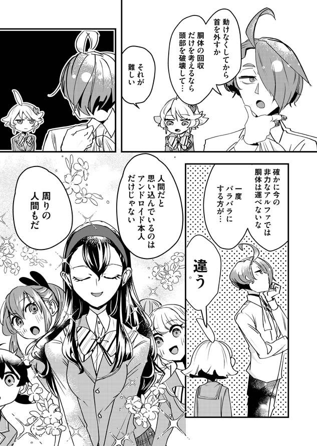 突如現れた才色兼備の転校生。思いがけず彼女から失ったボディパーツの反応を受信するアルファ。しかし、彼女をアンドロイドだと疑う人はおらず、また本人も自分を人間だと思い込んでいた。彼女に近づき謎を暴こうとするアルファだが、文化祭当日まさかの事態にーー!?