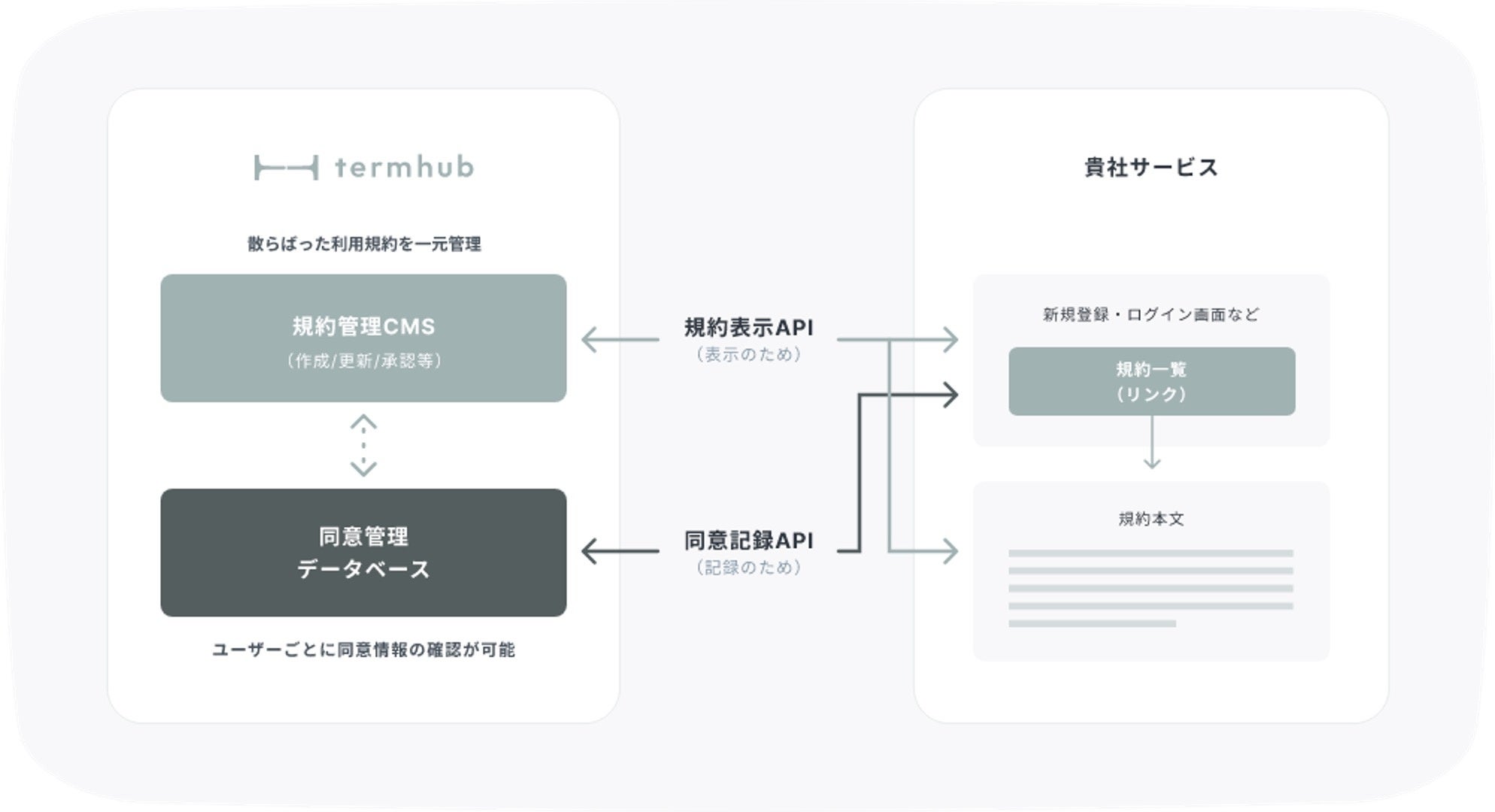 一方、企業では、規約の管理を通じた個人の同意情報を正しく運用しようとすればするほど、法務を中心とした管理部門の規約や同意情報の管理は複雑になり業務の負荷は高くなる構造になっています。上記のような課題に対して『termhub』は、利用規約や同意情報の管理業務支援を行い、法務部門の負荷を削減するサービスを提供。企業がユーザーと誠実な関係を構築する社会の実現を目指しております。