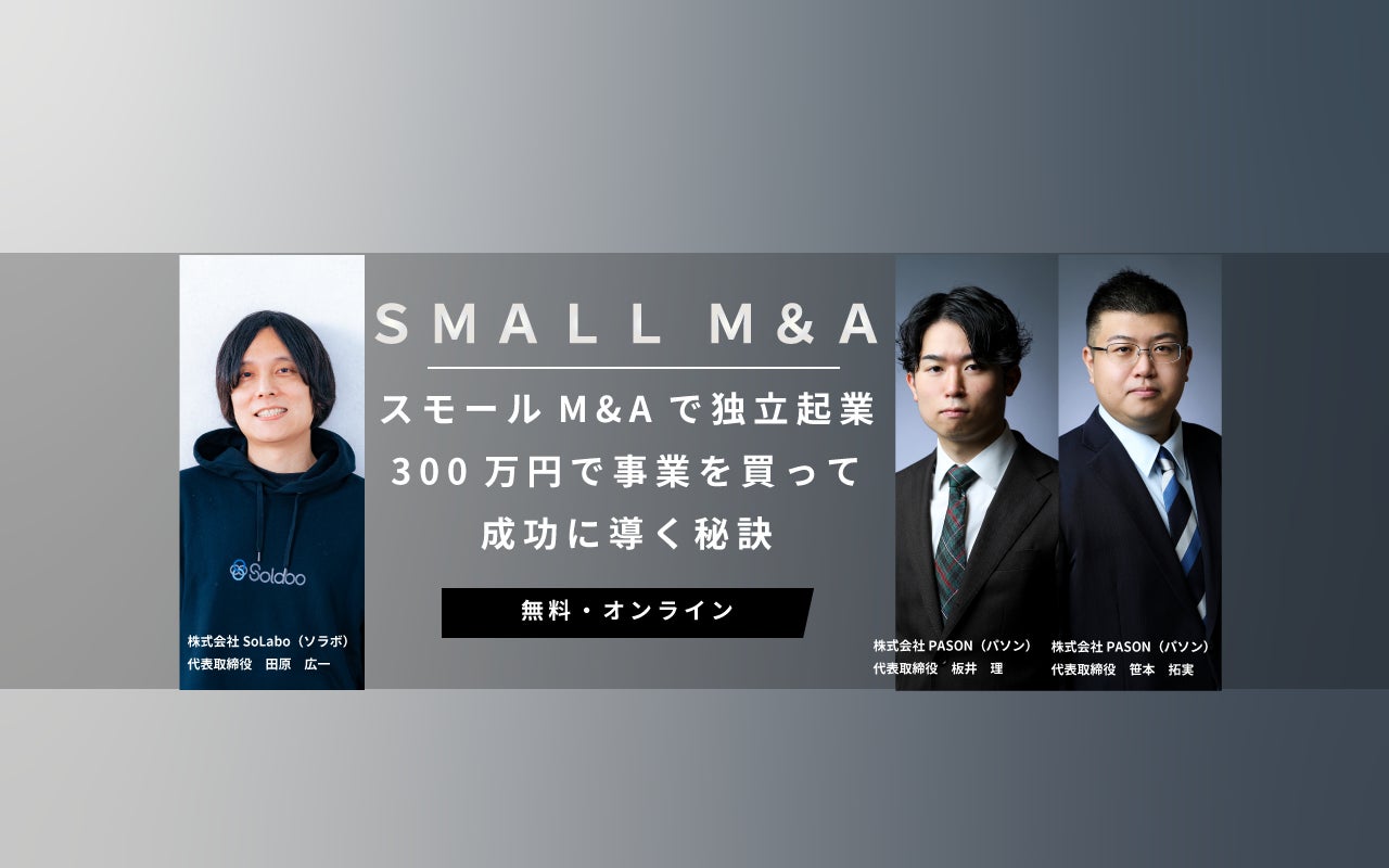 本セミナーでは、「スモールM&A」に焦点を当て、これから事業を始めたい人や事業を買いたいけれど不安な方に向けて事業の探し方や事業の成功事例・失敗事例を解説いたします。