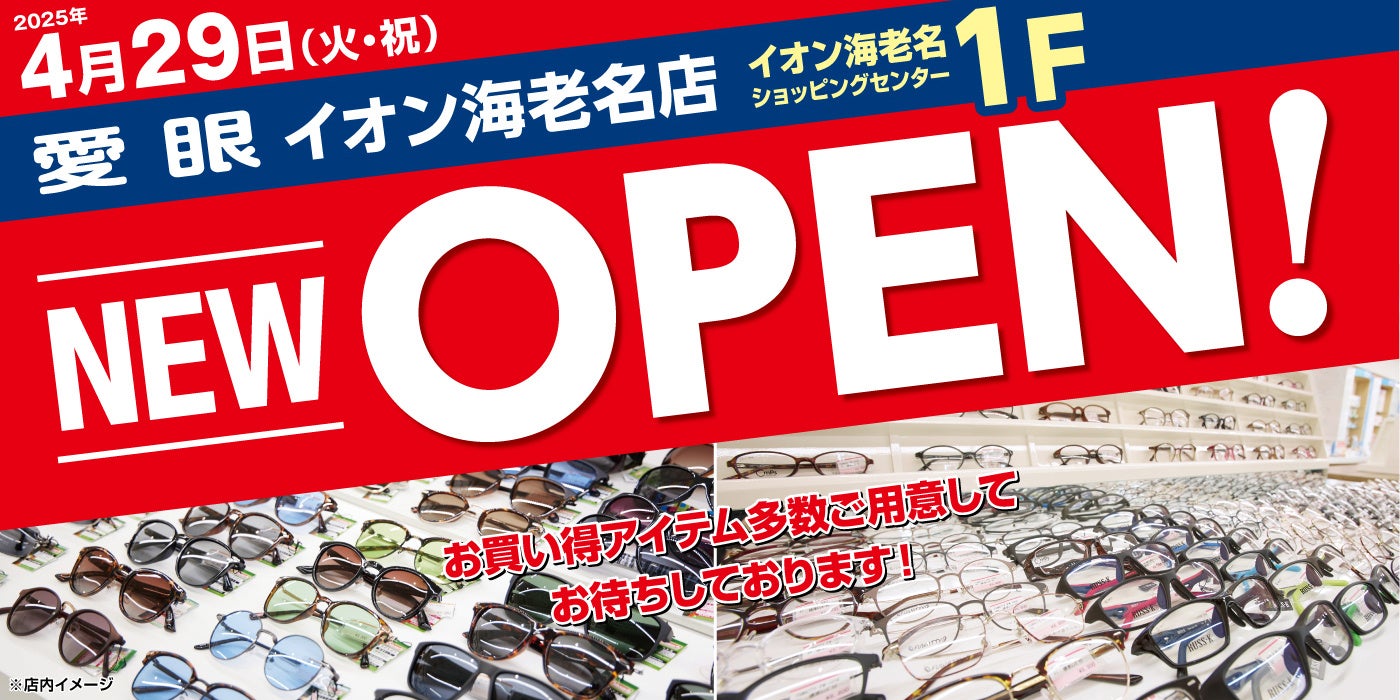 メガネ・補聴器を販売する「メガネの愛眼」「Aigan」 ( https://www.aigan.co.jp/ )を運営する愛眼株式会社(本社:大阪市天王寺区、代表取締役社長:佐々 昌俊)は、神奈川県海老名市の商業施設「イオン海老名店」1Fに「メガネの愛眼 イオン海老名店」を2025年4月29日(火・祝)、新オープンしましたことをお知らせいたします。