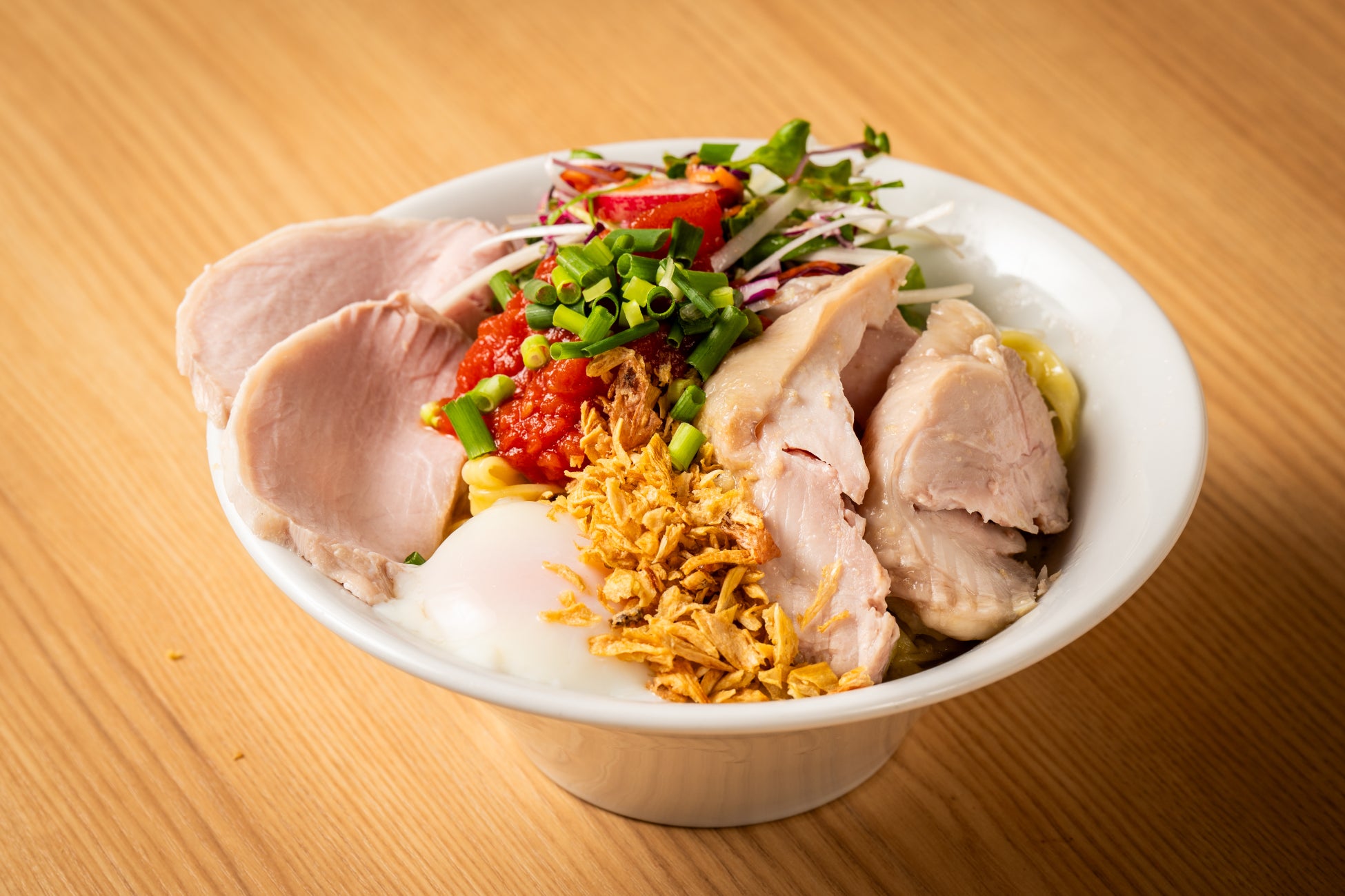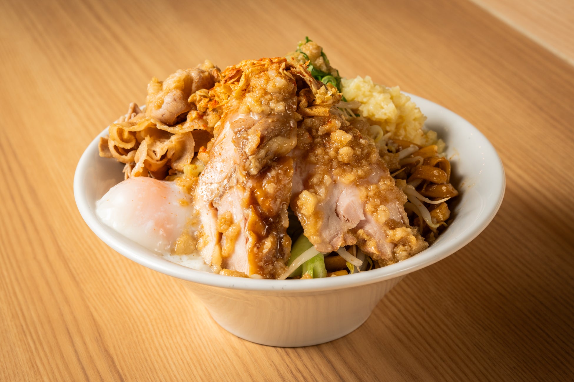 老若男女問わず人気を博している「背油生姜醤油つけ麺」が、“肉盛り”となってデリバリー限定で登場します。濃厚な醤油スープと甘みのある背脂、生姜のパンチ力を絶妙な加減で合わせた人気の味はそのままに、今回は豚と鶏、2種のチャーシューを盛り付けることで非常に食べ応えのある、贅沢な一品となりました。