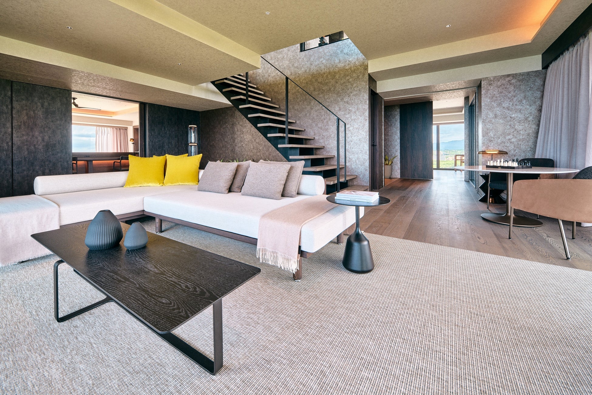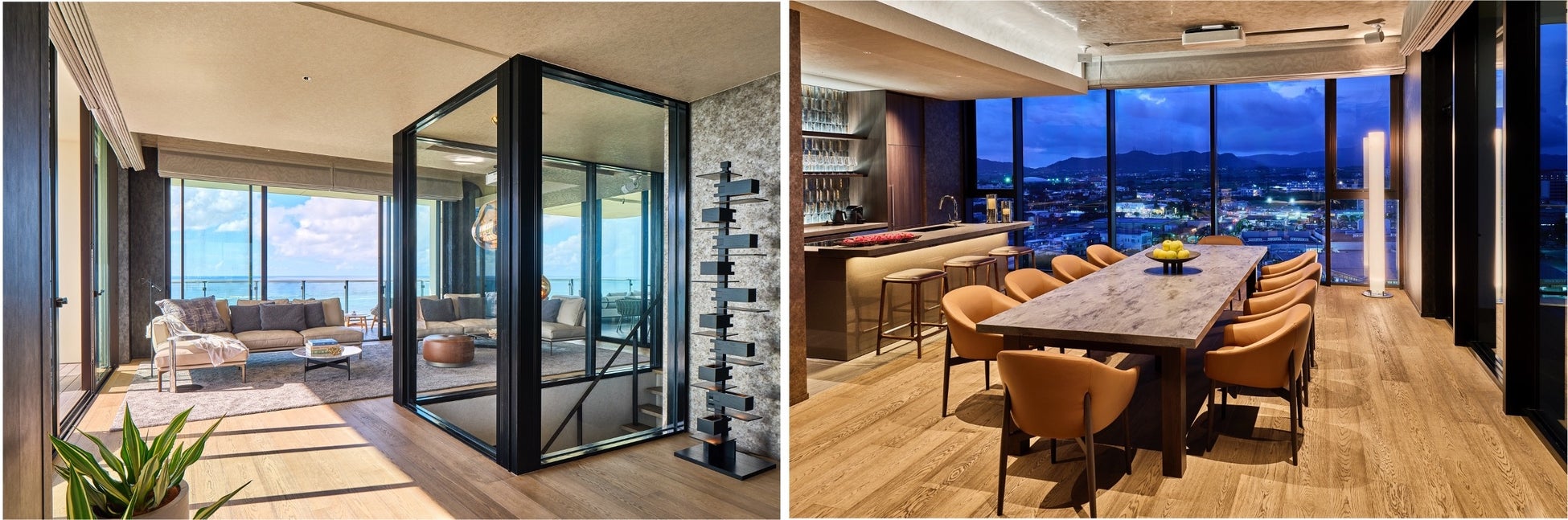 今回初公開となる「ザ・セブンペントハウス」は、ホテル最上階12階から13階に位置し、400㎡を超える広々としたメゾネットスイートルームです。石垣島の壮大なパノラマビューを楽しみながら、自然美と調和した贅沢でパーソナルなサンクチュアリをコンセプトに、自由で自律的なホスピタリティを提供します。