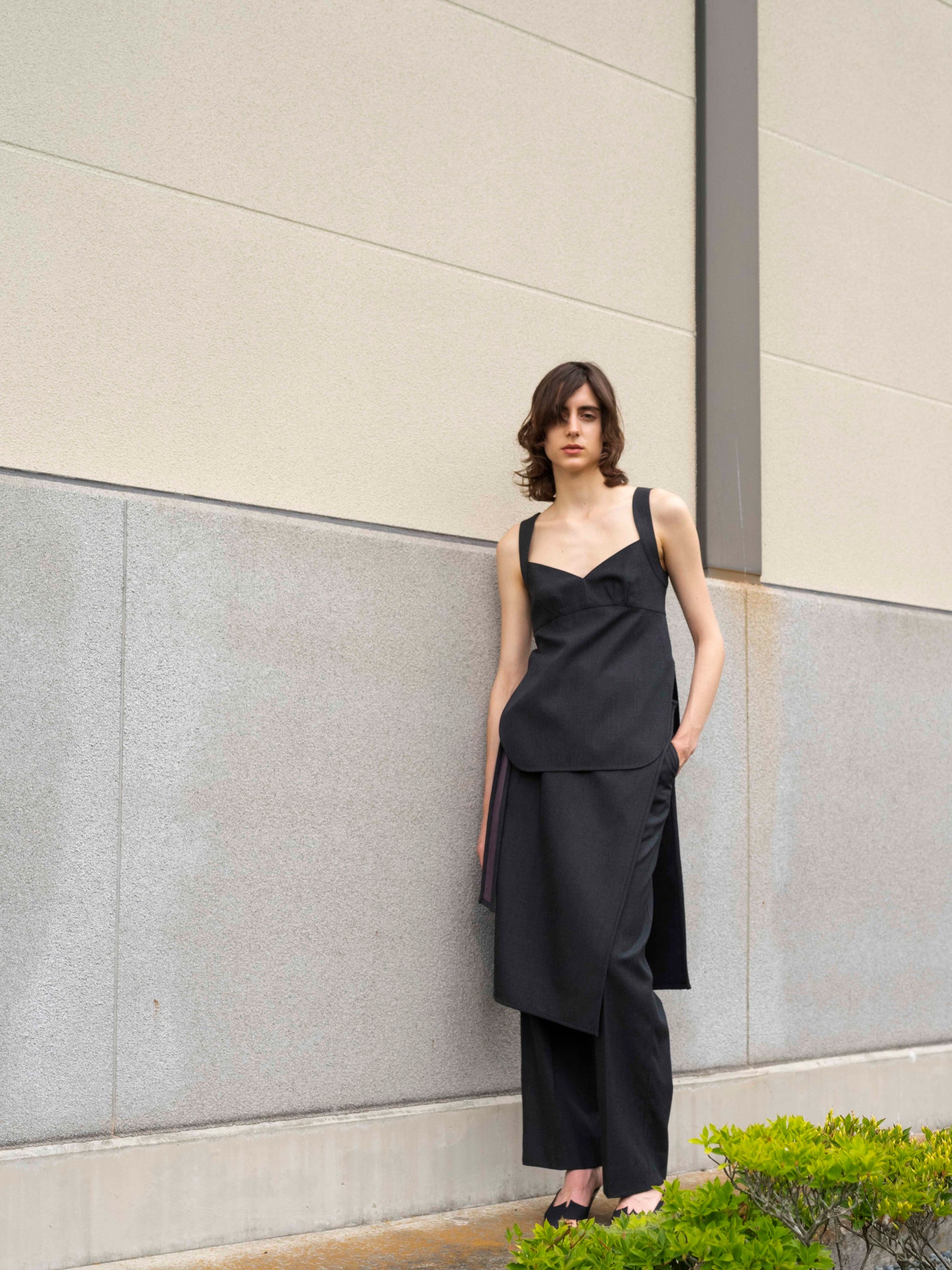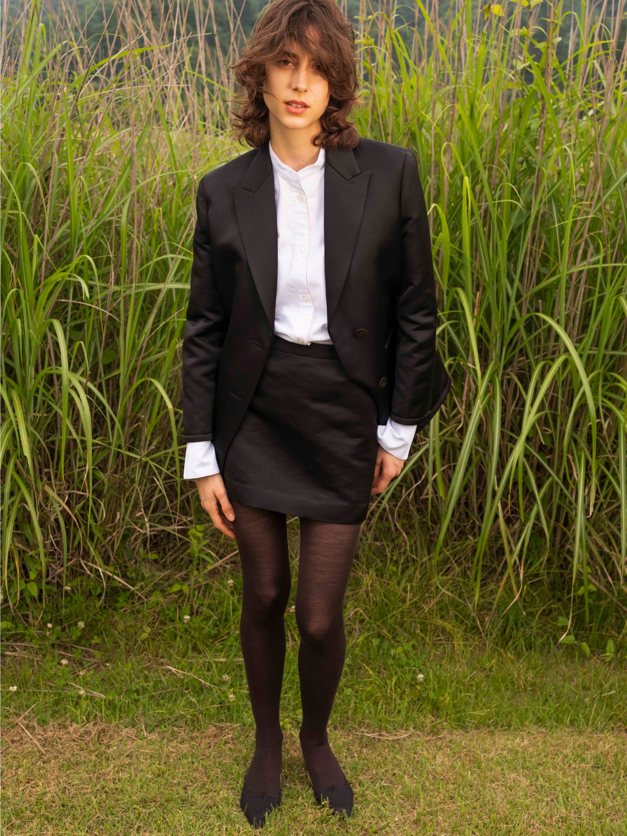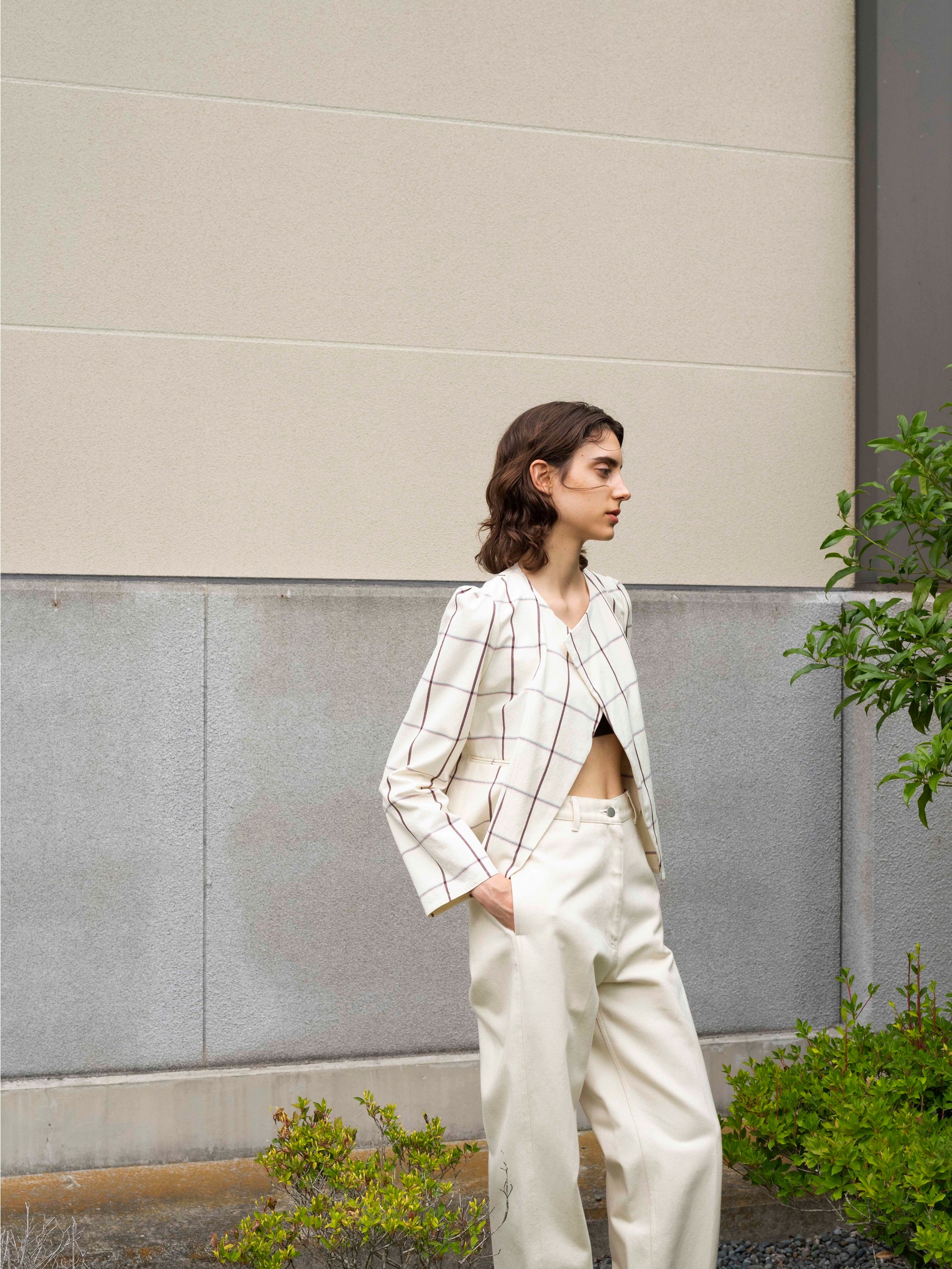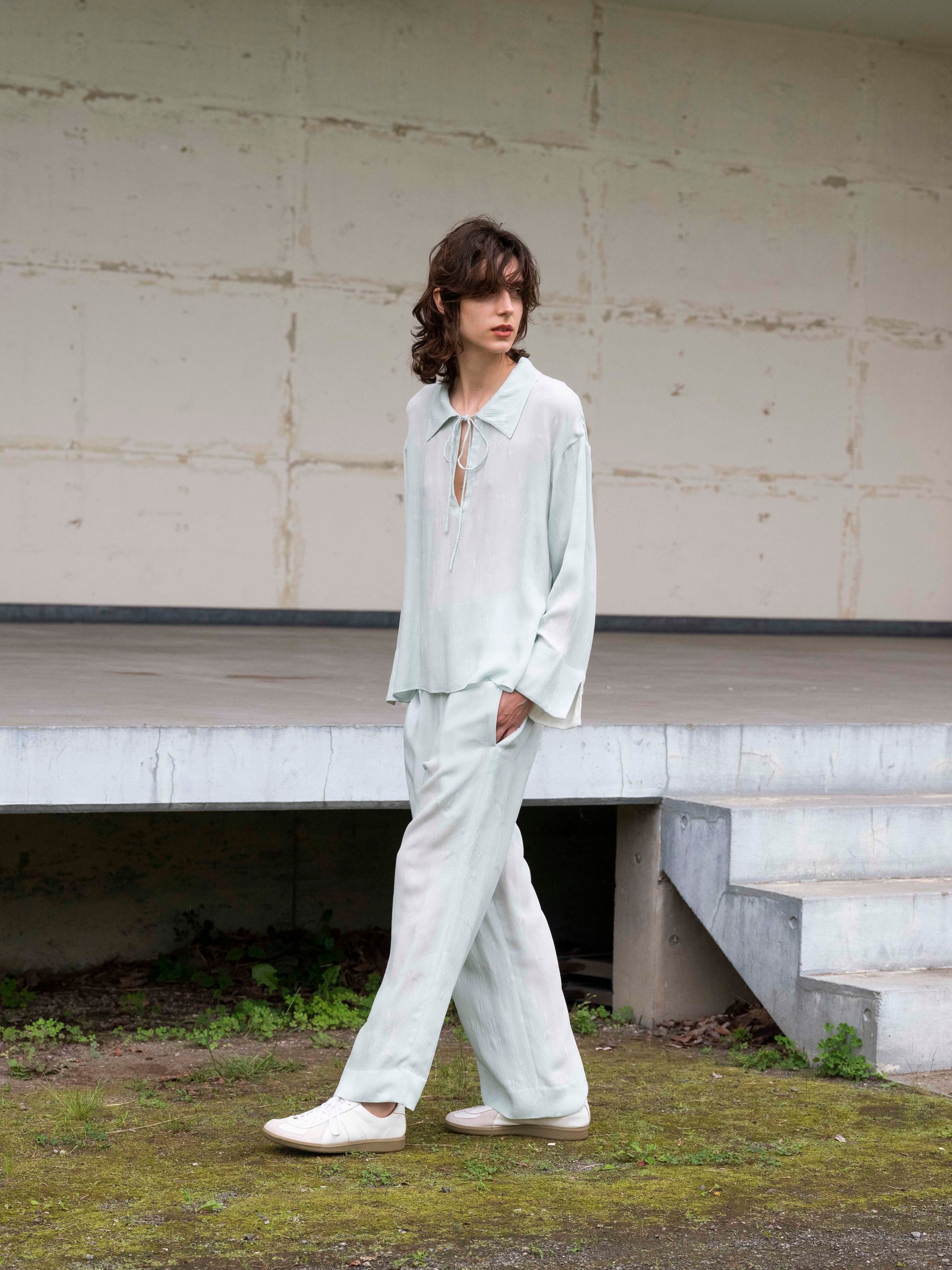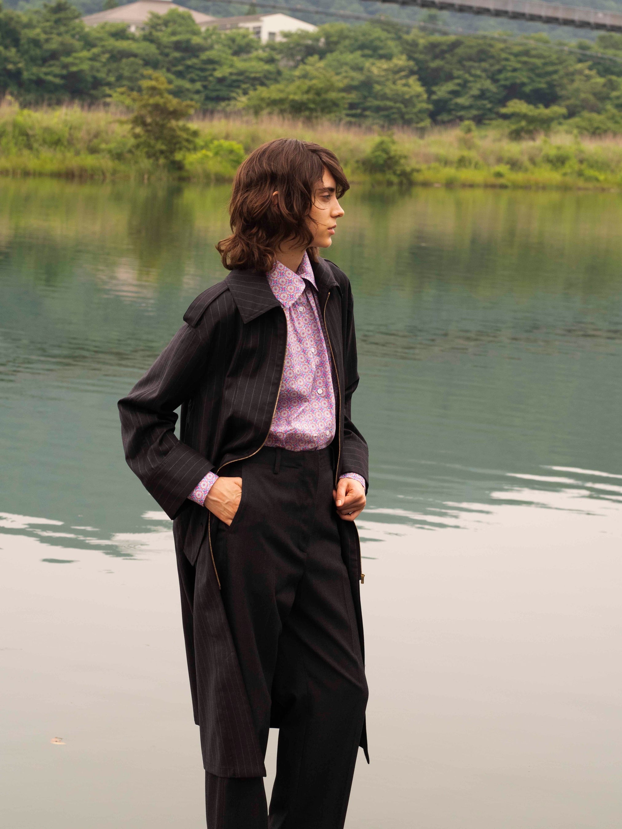 ブラウスは、高さのあるバンドカラーのボタンを留めるとクラシックに。前を開けてセーラーカラーのようにも着用可能。