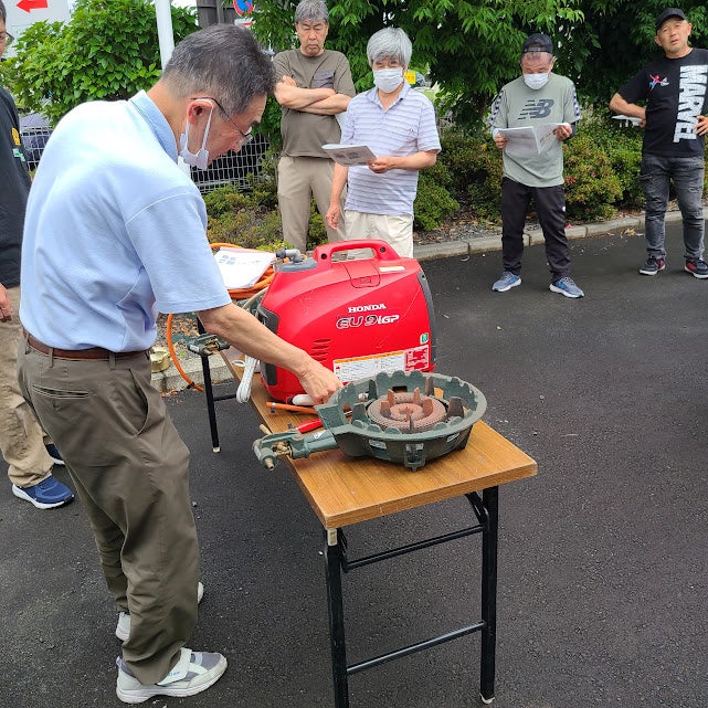 当日は、茶の木平町自主防災会、周辺住民が参加し、防災備品の使用方法の確認やガス点火のデモンストレーションを行い、地域の防災対応力を強化しました。