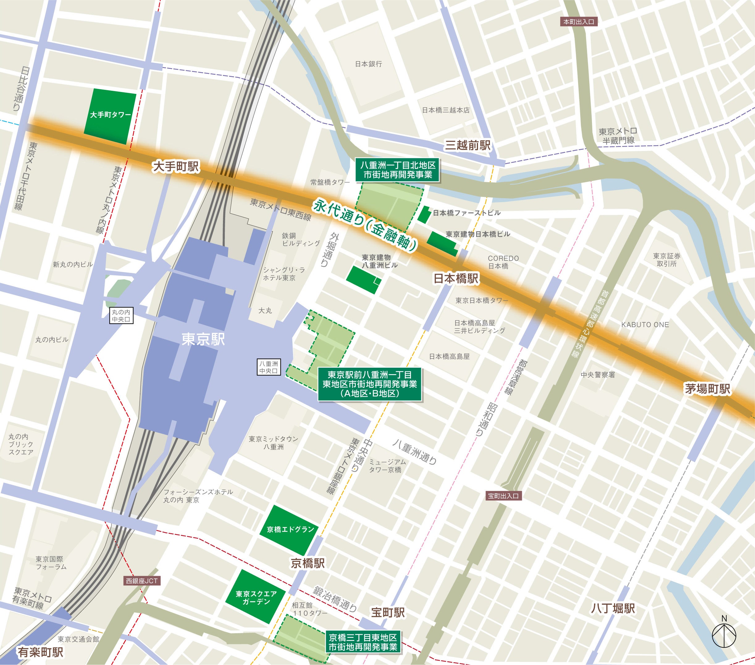 東京建物は、東京駅前のYNK(八重洲・日本橋・京橋)エリアにおいて、本事業を含めた複数の大規模複合再開発事業への参画等を通じ、多種多様な企業・人材の集積に向けた取り組みを行っています。本事業は、金融関連プレーヤーが集積する大手町と兜町をつなぐ永代通り沿いに立地しており、高度金融人材サポート施設や日本橋川沿いの連続的な水辺空間、歩行者ネットワークの整備等を通じて、国際競争力の強化を行うものとして国家戦略特区の指定を受けています。