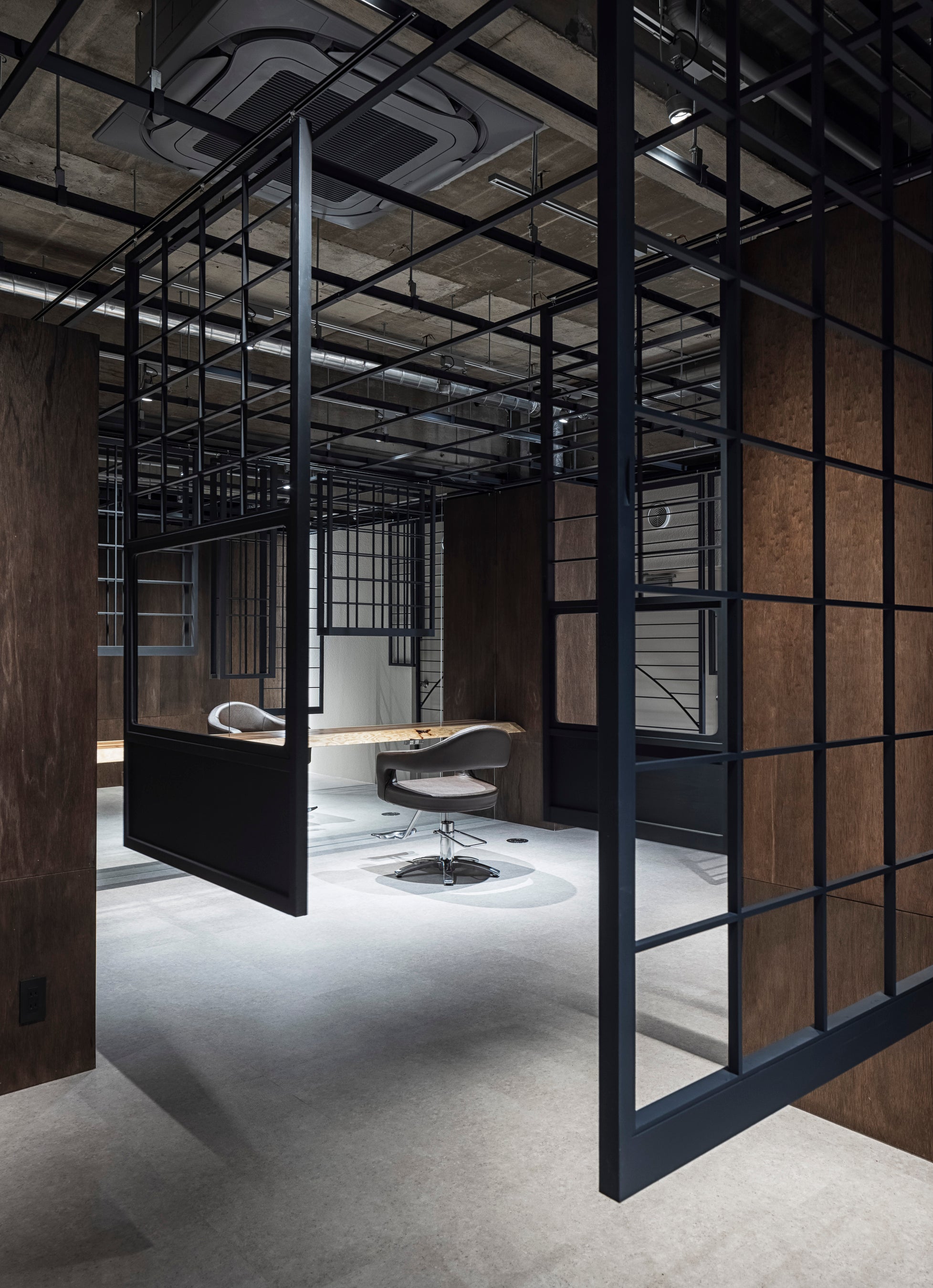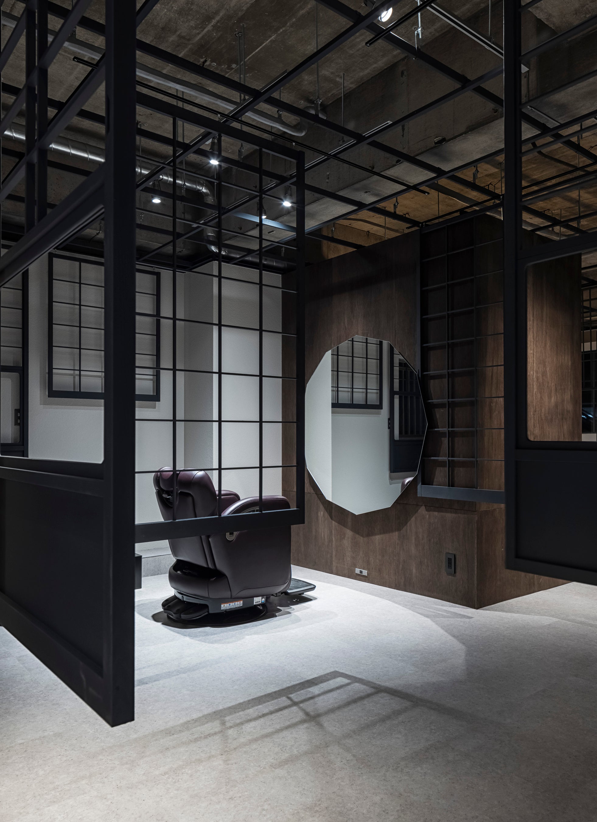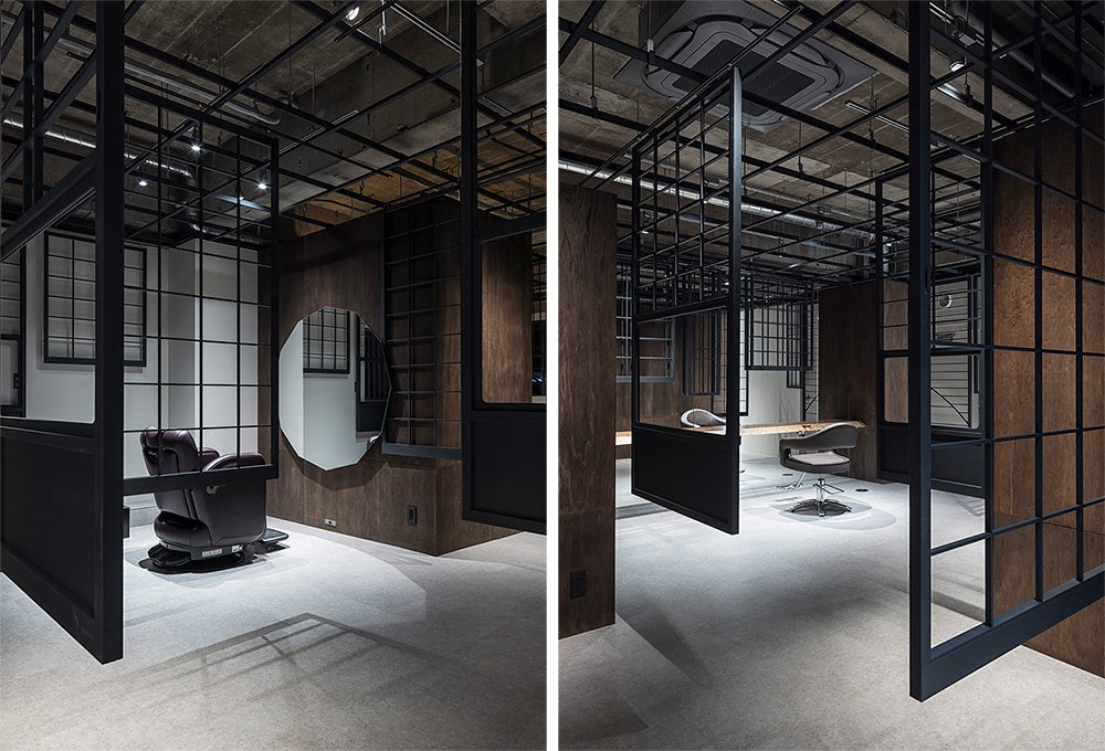 女性一人サロンの独立開業案件。オーナーは海外でのバックパッカーや海外勤務の経験から、様々な文化を取り入れたいと希望。和洋折衷の空間を構成する要素として、黒く塗りつぶされた格子を天井から吊り下げて空間を仕切る方法を採用。格子は可動式な為、人数やシーンに合わせて適切な空間をつくる事が可能となっている。格子により、閉鎖的にならずに周りが気にならないサロン空間が完成した。また、さまざまな世代の方が通えるよう、車椅子や高齢者の方を意識し、バリアフリーのサロンとした。