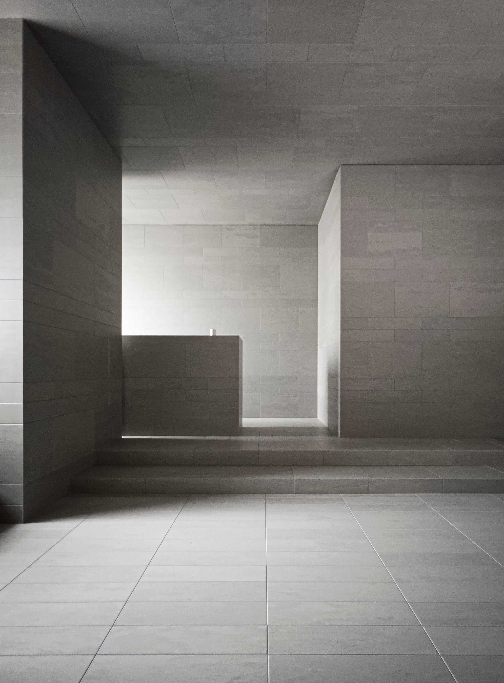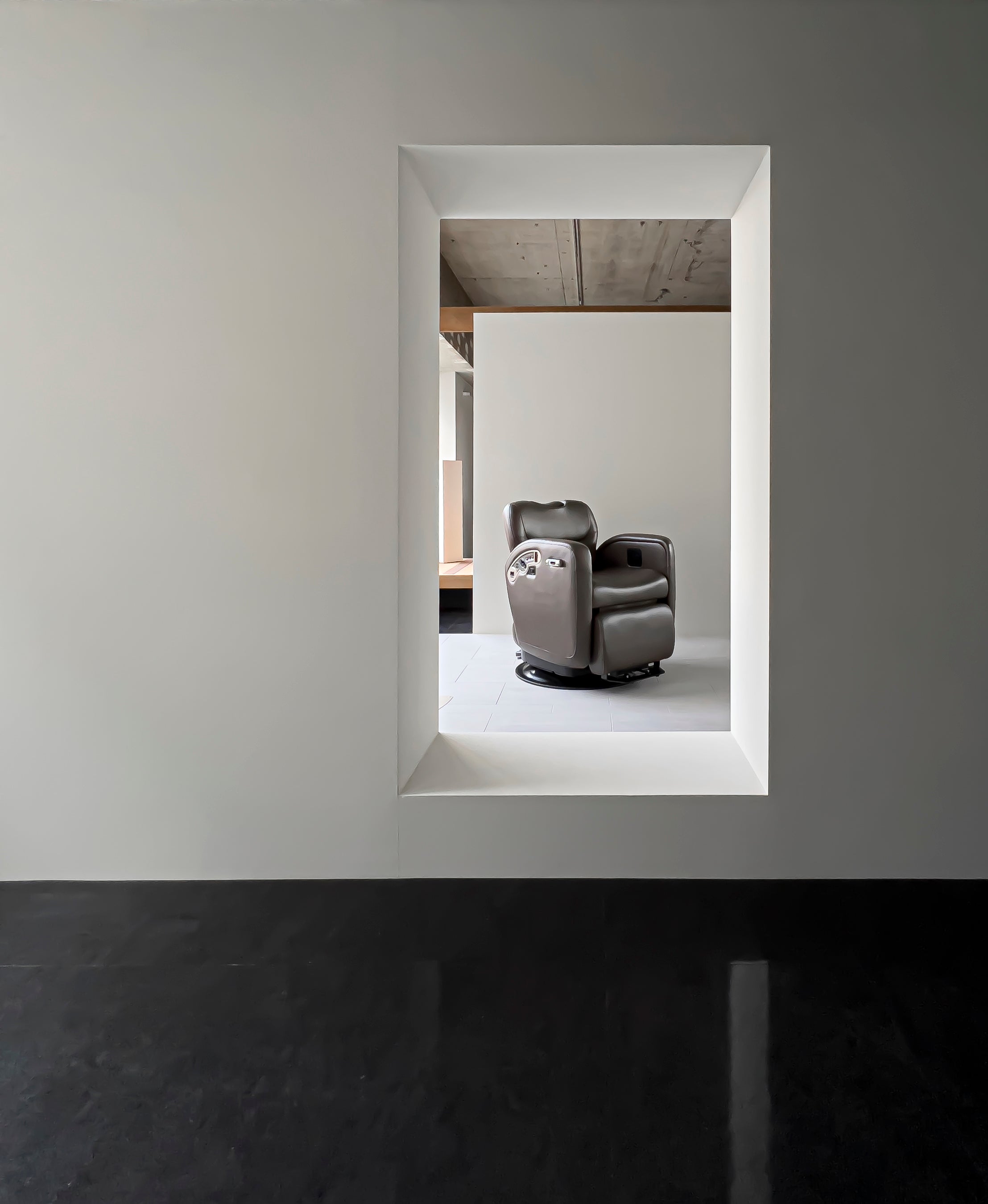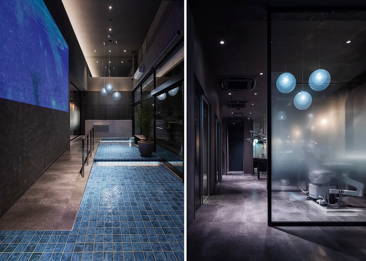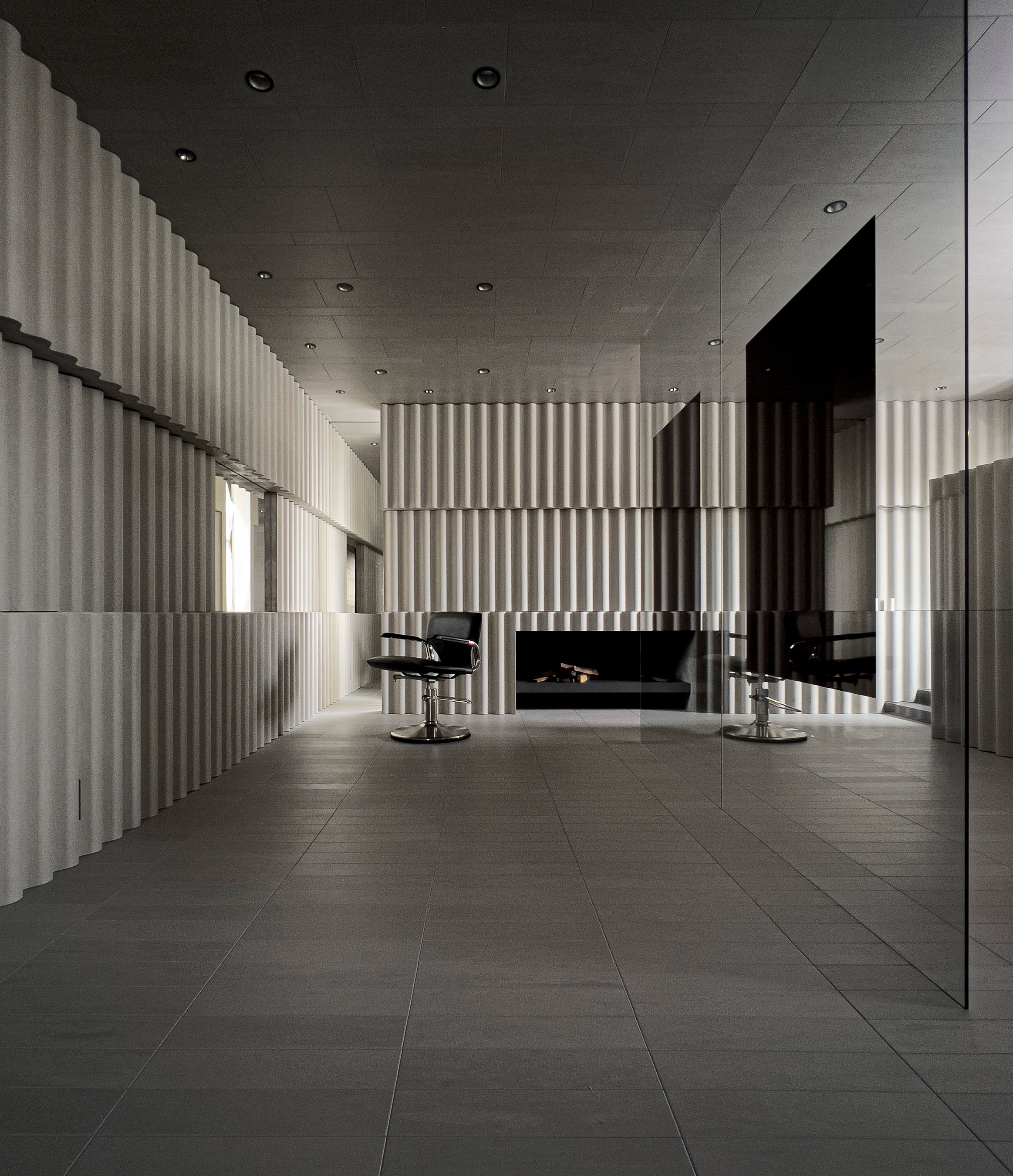 ご夫婦による郊外の独立開業案件。「白色や木目を使用せず、グレーのみの洗練された凛とした空間デザイン」が求められた。お客様やここで行われるサービスを主役と考え、それを引き立たせるために空間はグレーにしたいという意図である。店名の「Hui」はハワイ語で「集まる」の意。そこから着想し、グレー一色の空間に波で陰影をつけたグラデーションを添えた。波をズラして設置することで、陰影と併せて立体感や重厚感、オリジナリティを演出。またズレにより生まれる奥行きを活かしてディスプレイができる棚機能に充てた。 さらに、波とは対比的に石素材のみで構成するプレーンなカウンターを置くことで、空間全体に落ち着きを加えている。