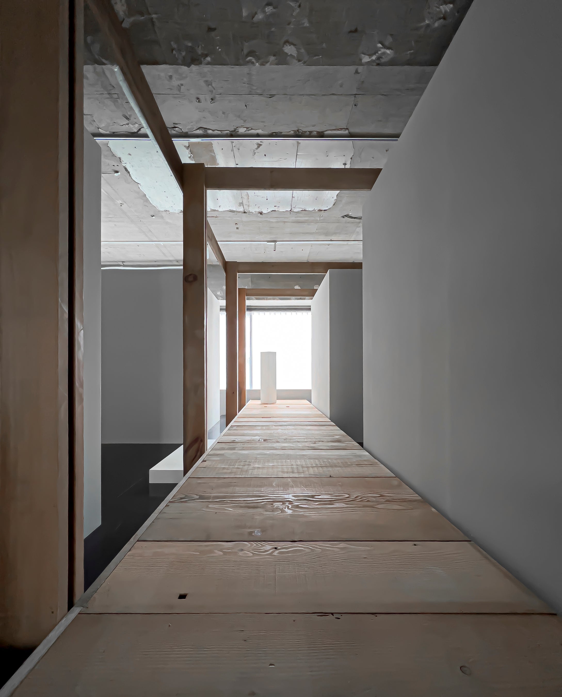 それらの要望をまとめ、4つの部屋を十字型の通路空間でつなぎ合わせる「田の字」レイアウトを採用。個室のプライバシーを高めることはもちろん、移動する際の期待感やリセットする時間など通路空間での体験に着目して空間を構成しました。黒い水盤を思わせる空間から、桟橋を思わせるウッドデッキの空間に進むと、先にはルーフバルコニーからのふんだんな自然光が待ち受け、そこから脇に降り個室へと進む導線をデザイン。進むに連れてシーンの変化が現れ、記憶に残る空間となっています。また、デッキや柱には木造住宅の解体時に取り外した古材を使用。加工や経年変化の跡、色ムラ等はそのまま使用し、外にいるような印象を空間に添えています。