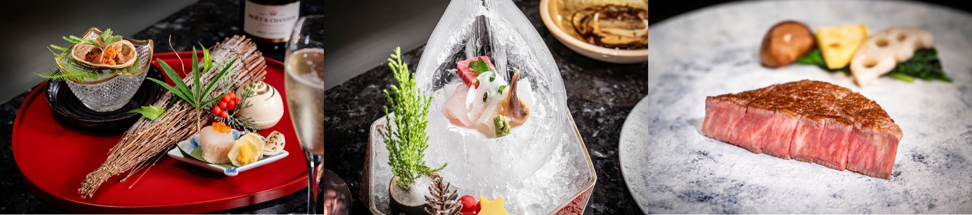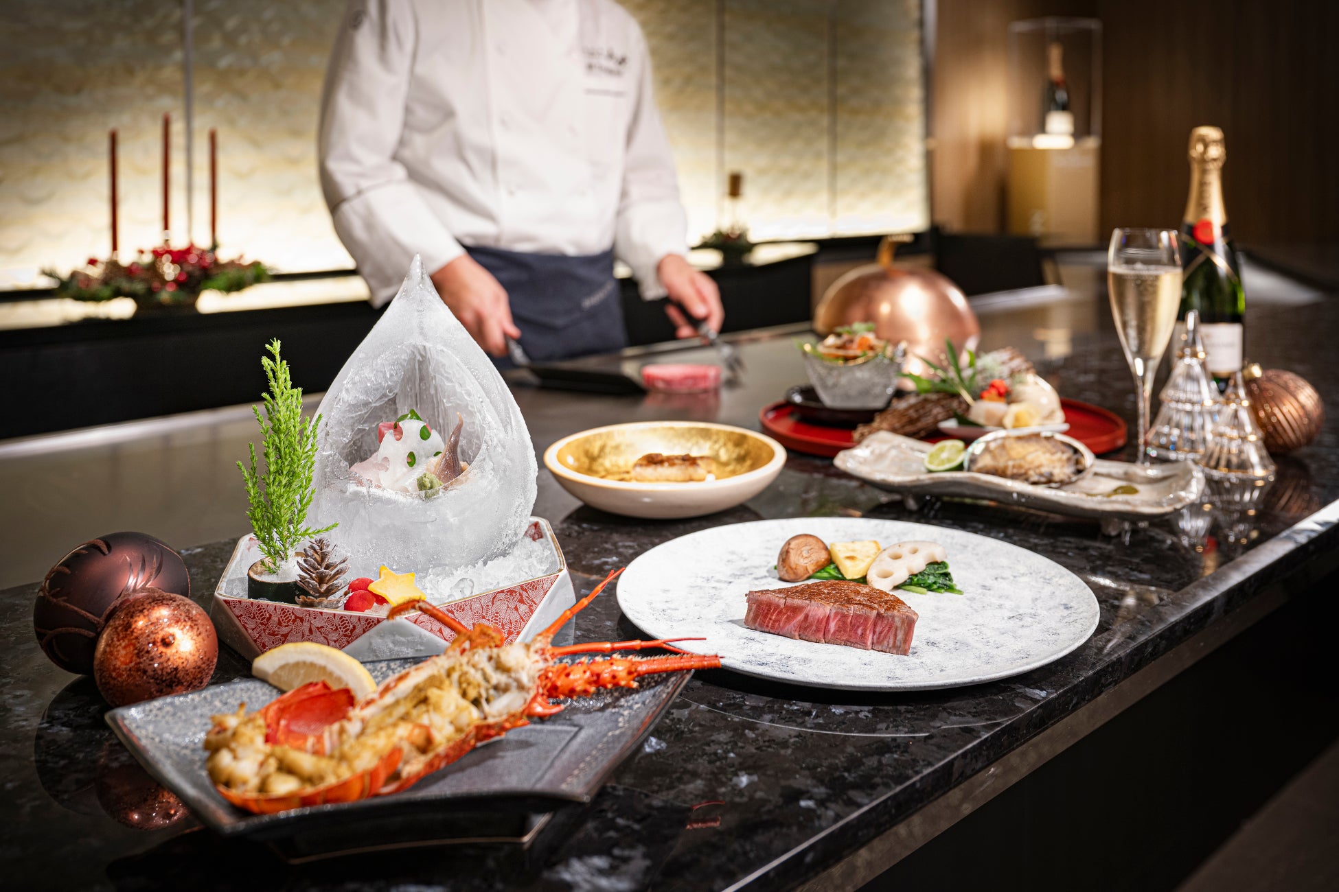 鉄板割烹「山吹」では、料理長 德留 雅が厳選した松阪牛やフォアグラ、伊勢海老、鮑など、贅沢な食材をふんだんに使用したクリスマス限定ディナーコースをご用意。オリジナルの氷の器に美しく盛り付けた御造里や、目の前で焼き上げる鮑や伊勢海老など、炎と氷が彩る「山吹」でしか味わえない特別な逸品が、心に残るクリスマスのひとときを演出します。さらに、ソムリエが選んだワインや日本酒とのペアリングもご用意。上質な空間の中で、大人のためのクリスマスをぜひご堪能ください。