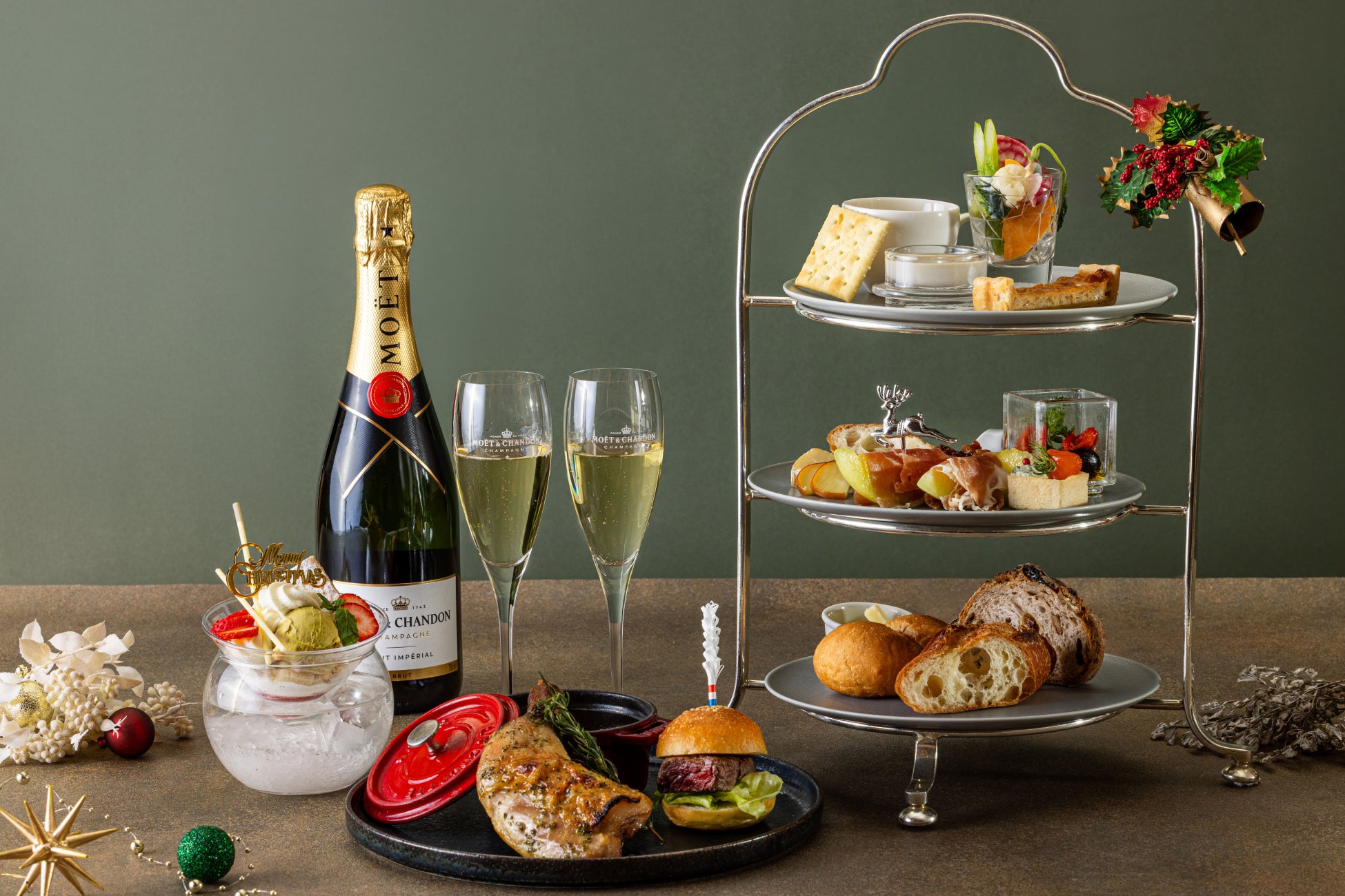 横浜の華やかな夜景とピアノの生演奏とともに、モエ・エ・シャンドンのシャンパンを好きなだけお楽しみいただける、クリスマス限定ハイティープランをご用意いたしました。お料理は三段のハイティースタンドでご提供し、優雅なひとときを演出いたします。シャンパンとシェフ髙木が心を込めて仕立てたお料理で、幻想的な夜景と音楽が演出するご褒美のようなひとときをぜひご堪能ください。
