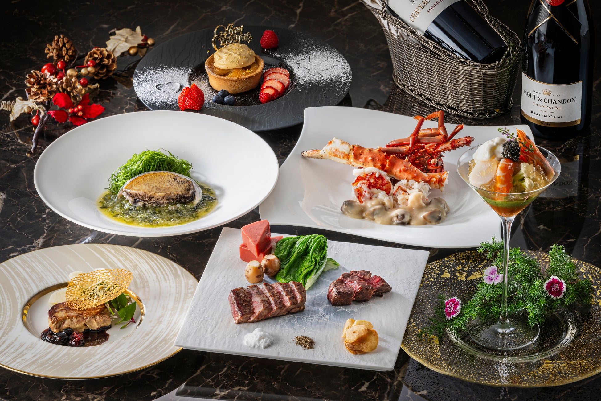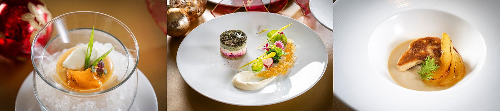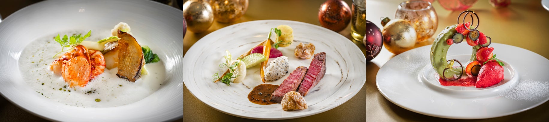 横浜の美しい夜景を望むフレンチ「ベイ・ビュー」では、シェフ髙木が厳選した季節の食材を贅沢に使用したクリスマスを彩る特別なディナーコースをご提供いたします。コースの始まりには、雲丹と新鮮なカリフラワーを重ねたヴェリーヌをご用意。海と大地の豊かな味わいを一皿でご堪能いただけます。繊細な旨みを持つタラバ蟹と帆立をガトー仕立てにし、キャビアをふんだんに使用したオードブルには、根セロリのブルーテや、輝く宝石をイメージしたコンソメのジュレが華やかな彩りを添えます。魚料理には、鮮度にこだわった豪華オマール海老や鮑をフリカッセでご用意。シャンパンを用いたカプチーノソースとフレッシュハーブの香りが、素材の美味しさを引き立てます。肉料理には、松阪牛フィレ肉に加え、希少なリードヴォをムニエルでご提供。黒トリュフを惜しみなく使用した濃厚なソースと、芳香なトリュフリゾットを合わせて贅沢なひと品に仕上げました。こだわりのデザートは、希少なベネズエラ産カカオ“チュアオ”で作るショコラムースをピスタチオのチョコレートでコーティングし、赤い果実とともに艶やかなクリスマスリースに見立てました。ディナーのフィナーレを彩るクリスマスならではの一皿です。