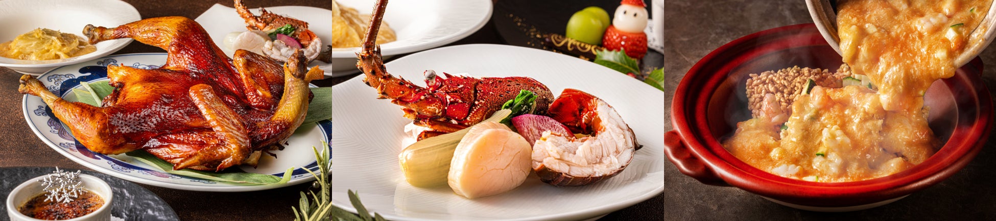 新料理長の南が腕を振るうクリスマスディナーコースのメインには、厳選した山口県産「長州黒かしわ鶏」をご用意。香辛料でマリネし、専用窯でじっくり焼き上げました。香ばしくパリッとした皮と、しっとり柔らかな肉質をお楽しみください。また、伊勢海老や帆立などの海鮮と厳選した国産中国野菜の炒めや、上海蟹入り餡かけのおこげなど、バラエティ豊かにお届けします。デザートには點心師による特製クリスマスデザートプレートをご提供。彩り豊かな中国料理とともに、新料理長が紡ぐクリスマスのひとときをお過ごしください。
