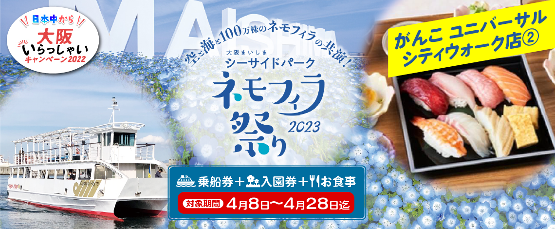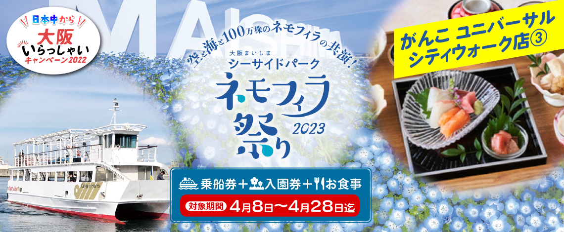 新メニュー登場!【4/28出発限定】大阪出発《全国旅行支援》《舞洲ネモフィラ祭り入場券付》往復舞洲シャトルクルーズ+「がんこユニバーサルシティウォーク店」選べるランチ付き日帰りプラン