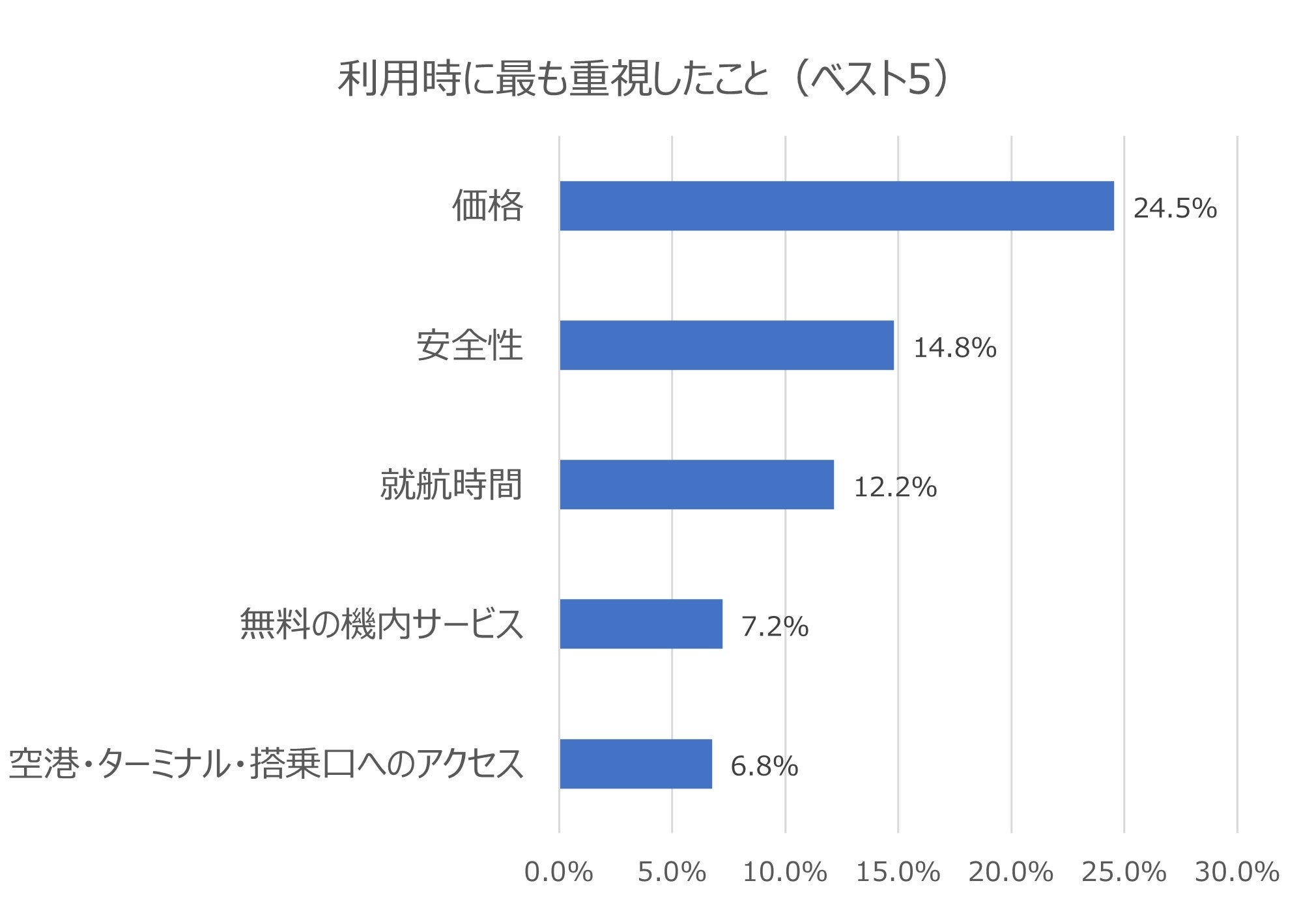 飛行機を使って国内旅行をする際、航空券の主な予約方法は「旅行会社経由で予約」が39.6%と最多で、「航空会社に直接予約」(30.7%)、「チケット検索・比較サイトから予約」(28.4%)と続きました。また、最もよく利用している航空会社を利用する時に最も重視していることは「価格」が55.8%と最多、次いで「安全性」「就航時間」と続きました。