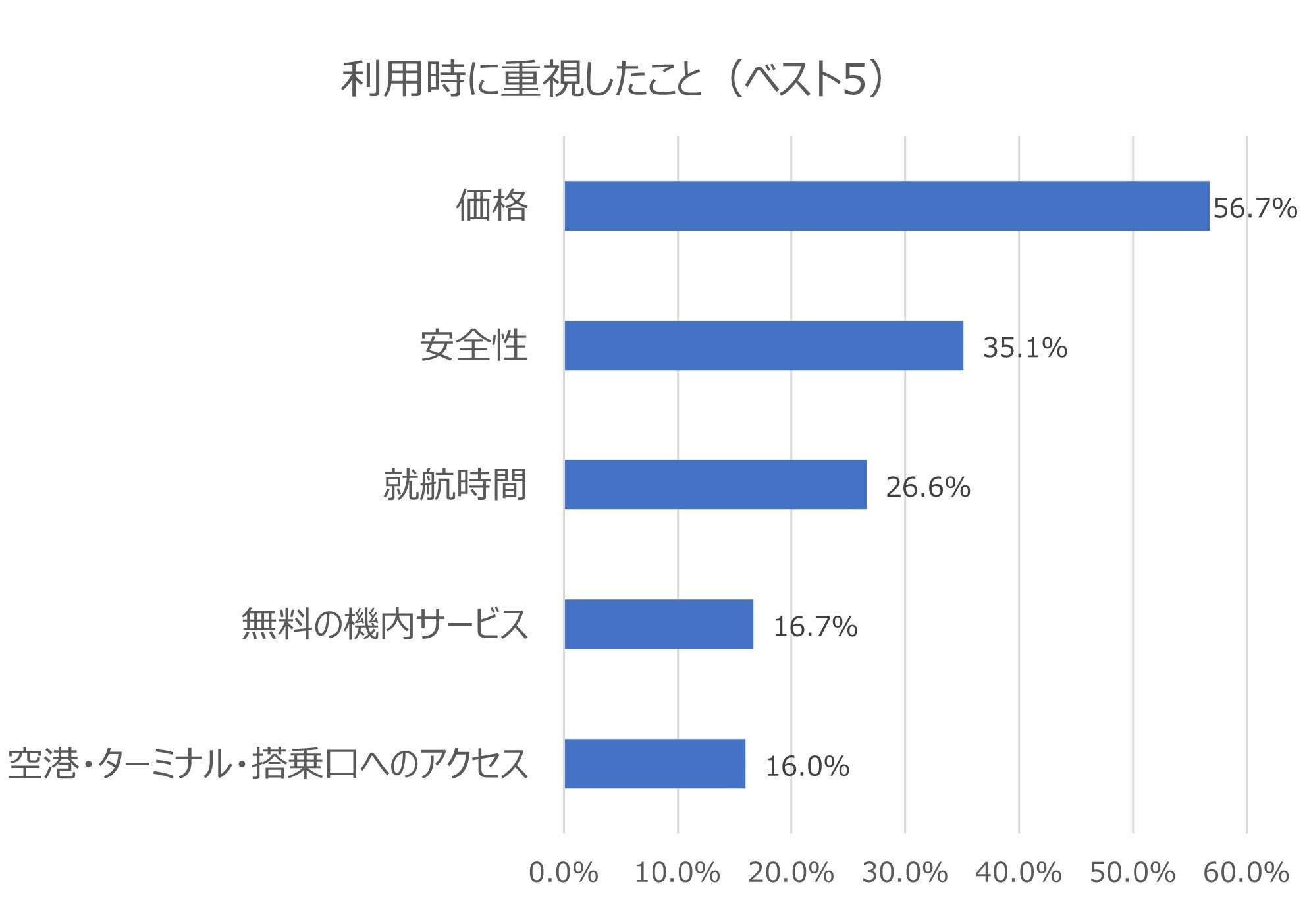飛行機を使って国内旅行をする際、航空券の主な予約方法は「旅行会社経由で予約」が40.1%と最多で、「航空会社に直接予約」(30.6 %)、「チケット検索・比較サイトから予約」(27.5 %)と続きました。最もよく利用している航空会社を利用する時に最も重視していることは「価格」が56.7%と最多、次いで「安全性」「就航時間」と続きました。航空券の主な予約方法と利用時の重視の上位項目は、ウーマンリサーチ同様の結果となりました。