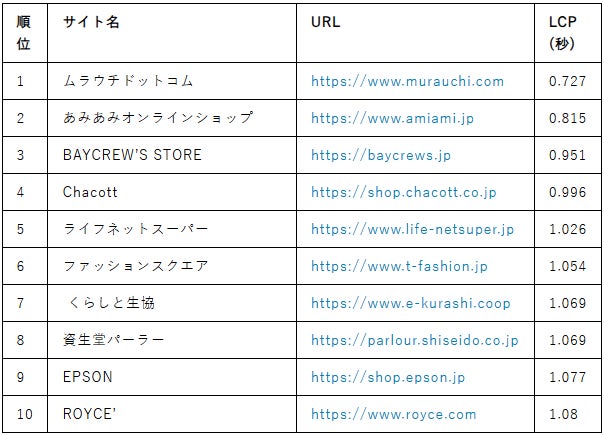 1秒の壁を突破する重要性:今回の調査で特筆すべきは、トップ10のサイトすべてがLCP(Largest Contentful Paint)1.1秒以下を達成していることです。特に、「ムラウチドットコム」、「あみあみオンラインショップ」、「BAYCREW’S STORE」、「Chacott」は1.0秒の壁を突破しており、表示速度に関しては最適な状態と言えます。