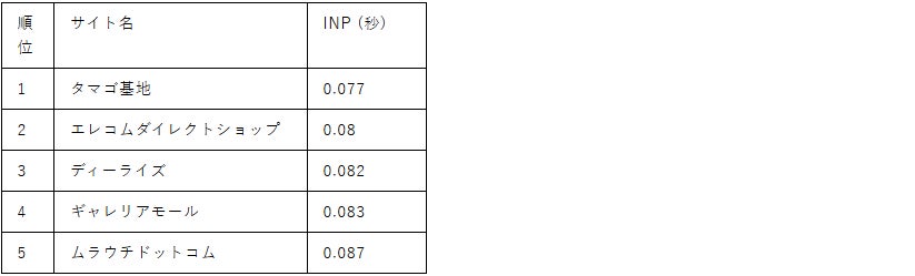 今月のトップ5には、「ムラウチドットコム」がランクイン。これら上位のサイトは、LCPが非常に高速であることに加え、INPについても良好なスコアを維持しています。表示スピードと操作性の双方が高水準で最適化されていることが常連企業の強みとなっており、LCPと併せてINPの品質維持も上位ランクインの必須条件と言えそうです。