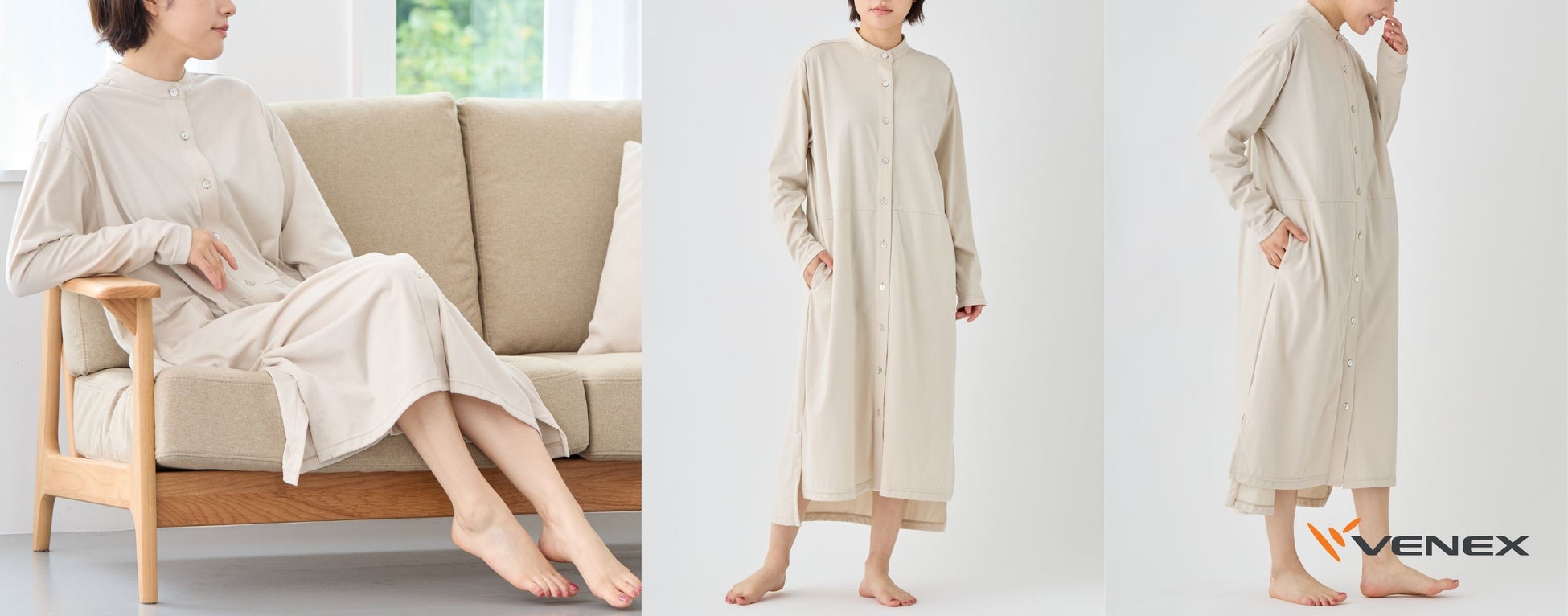 今回体験いただけるVENEXリカバリーウェアは、前開きのシャツタイプの長袖ワンピース。低めに配置した後ろのタックやゆったりとしたシルエットが、リラックス感がありながらもきれいめな素材感から上品な印象に。貝ボタンや脇ポケット付きなどディテールにもこだわっています。