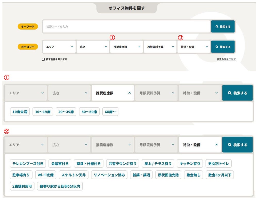 ① 初めてのオフィス選びでも安心!予算に応じて選べる「月額賃料予算」、「推奨座席数」で検索可能