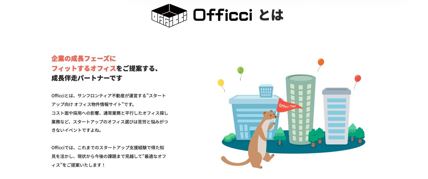 「Officci」(オフィッチ)は、オフィス+フィット・フィッチ(ぴったり合う/金物の繋ぎ)の造語で、企業の成長に伴走するパートナーとして、親しみやすさを感じるような音の響きから名付けました。「フィッチ(Fitch)」は、英語でイタチという意味もあり、俊敏なイタチのように、スタートアップ企業のニーズにフィットする物件をすぐに探しだし、チャンスを掴んでほしいという願いを込めています。