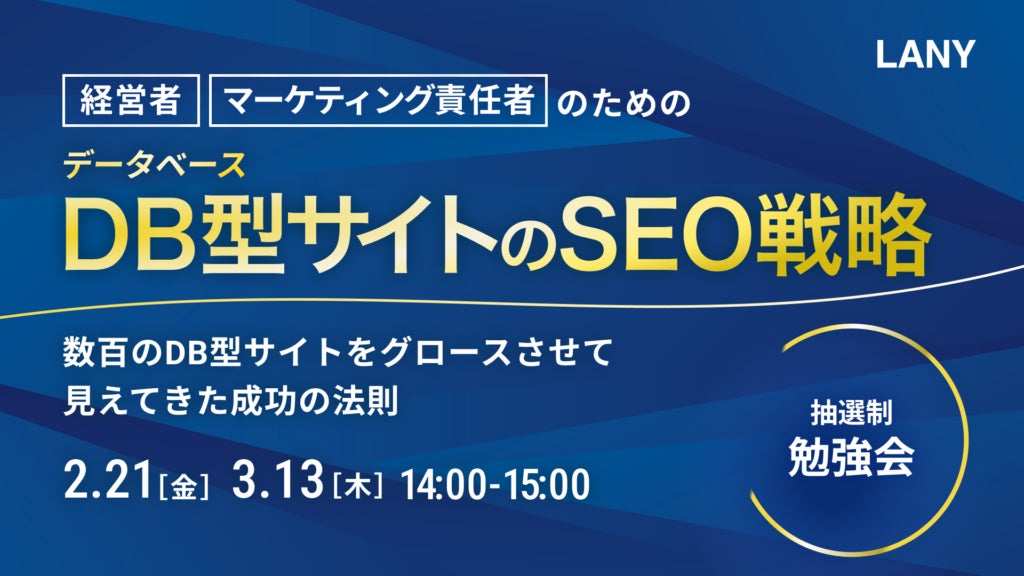 デジタルマーケティング支援を行う株式会社LANY(東京都渋谷区、代表取締役社長:竹内渓太)は、【無料勉強会】データベース型サイトのSEO戦略〜数百のデータベース型サイトをグロースさせて見えてきた成功の法則〜を2/21(金)・3/13(木)に開催いたします。