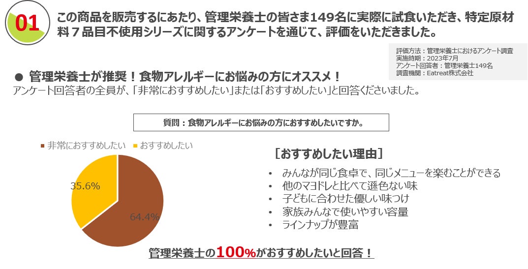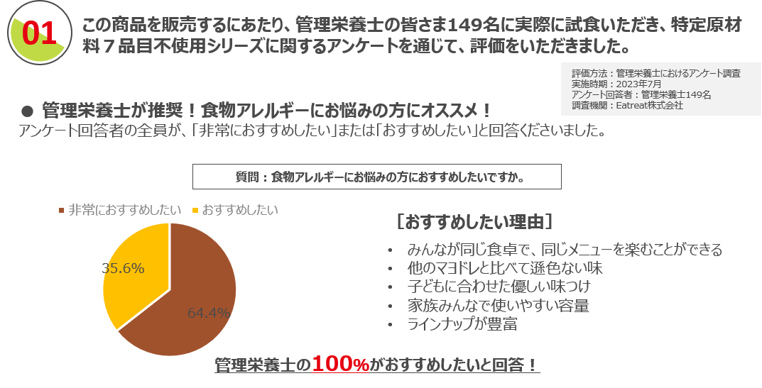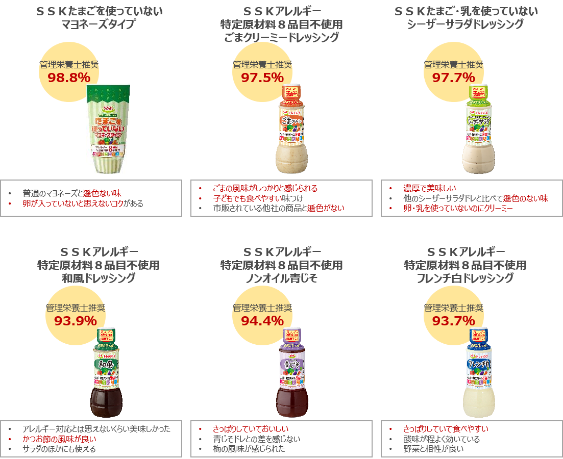 エスエスケイフーズ株式会社(本社:静岡市葵区、代表取締役社長 中村 悟)は、全国の管理栄養士を対象に 「アレルギー特定原材料7品目不使用シリーズ」6品に関する調査を外部機関で実施しました。管理栄養士149名全員の方から、本シリーズを食物アレルギーにお悩みの方におすすめしたいという回答を得ました。