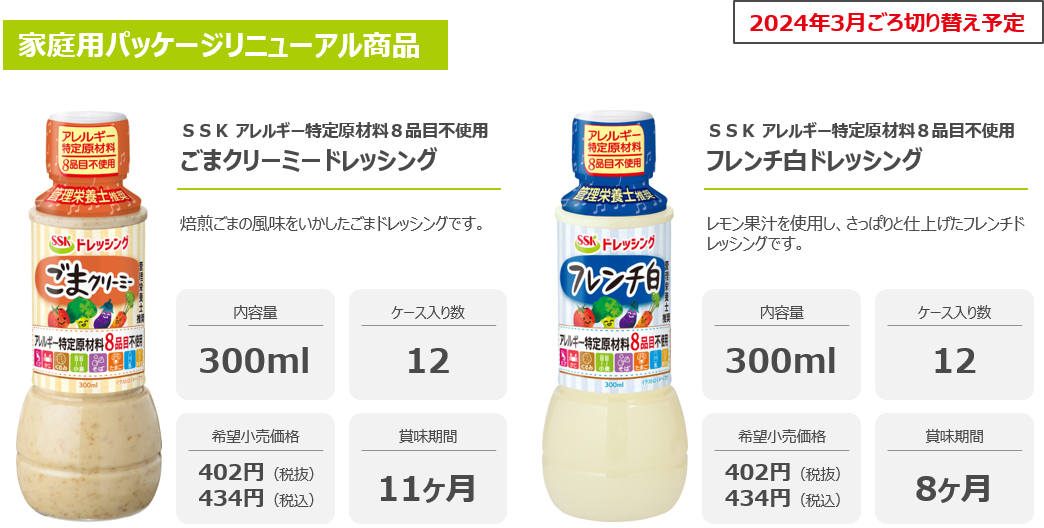 また、「食物アレルギー表示義務」改正に伴い、本シリーズ名を「アレルギー特定原材料8品目不使用シリーズ」に変更し、商品名、パッケージデザインをリニューアルします。2024年3月ごろの切り替えを予定しています。