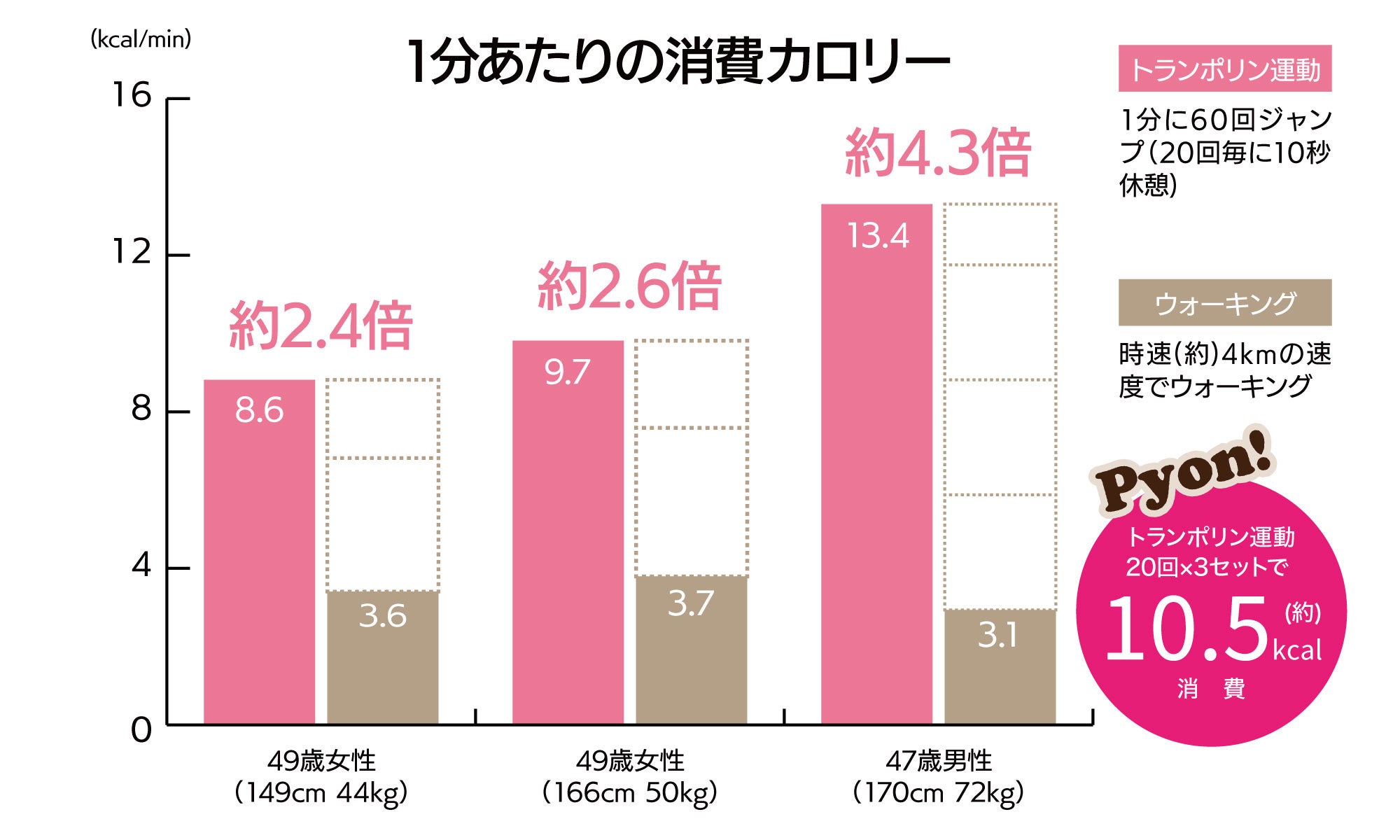 本商品を使用してトランポリン運動をすると、なんと1分間で平均10.5kcalも消費!これはウォーキングで消費するカロリーの約3.4倍相当。お家で気軽にできるのに効率よくカロリー消費ができます。