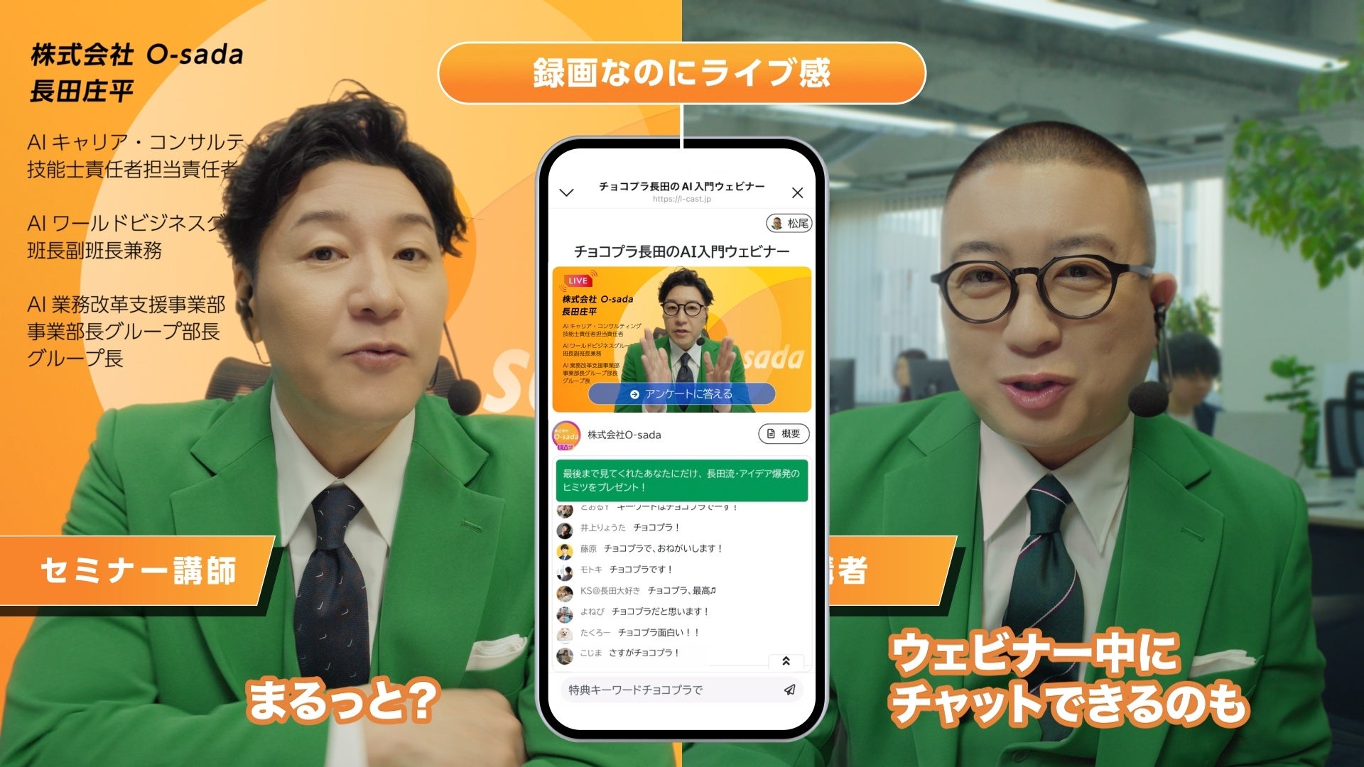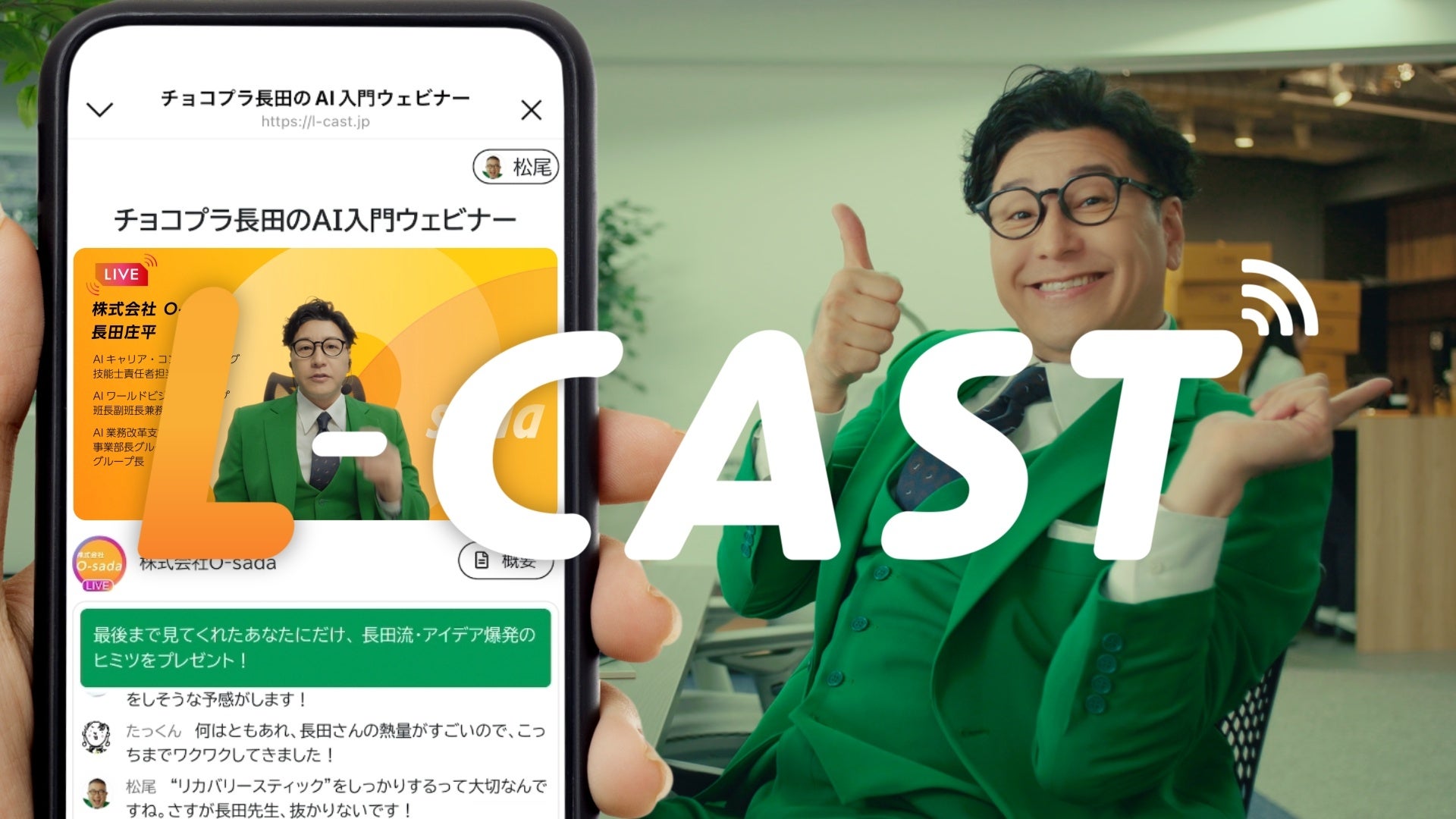 ・狙い:L-CASTとは何か。そのサービス内容がちゃんと届くために、CMの設定自体を「ウェビナー中」にしました。講師役の長田さんが会話の端々に面白さを注入してくれました。こちらも負けじと、バーチャル背景からチャットの文面にいたるまで面白さを追求しましたので、ぜひご覧ください。