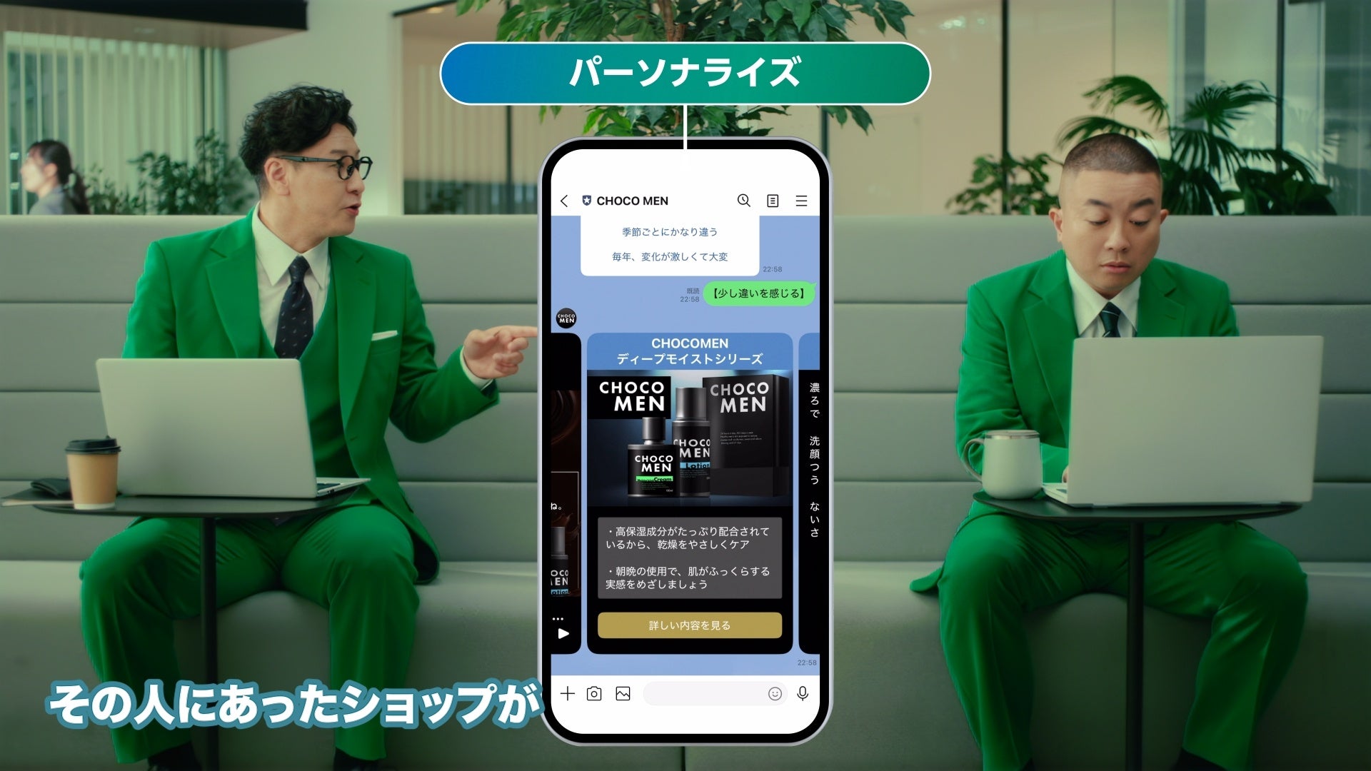 ・狙い:LINE上でここまで商売ができるのか!とビックリしてもらいたくて。CMの中央にたえずUIを置くことにしました。あとはストレートトークをどこまでエンタメ化できるか。こちらが言いたい話を、皆さんが聞きたい話に変えていきます…。なんて言いつつ、ただただ、お二人のトークの上手さに助けられるばかりでした。