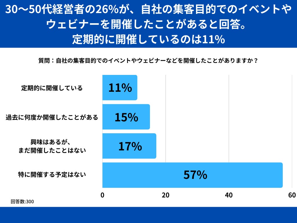 30~50代経営者の26%が、自社の集客目的でのイベントやウェビナーを開催したことがあると回答。定期的に開催しているのは11%【ビジネスイベントに関するアンケート】