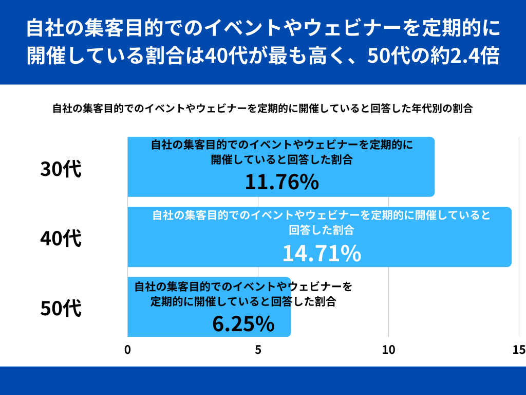 自社の集客目的でのイベントやウェビナーを定期的に開催していると回答した割合を年代別でみてみますと、40代が最も高く14.71%、次いで30代が11.76%、50代は6.25%という結果になりました。