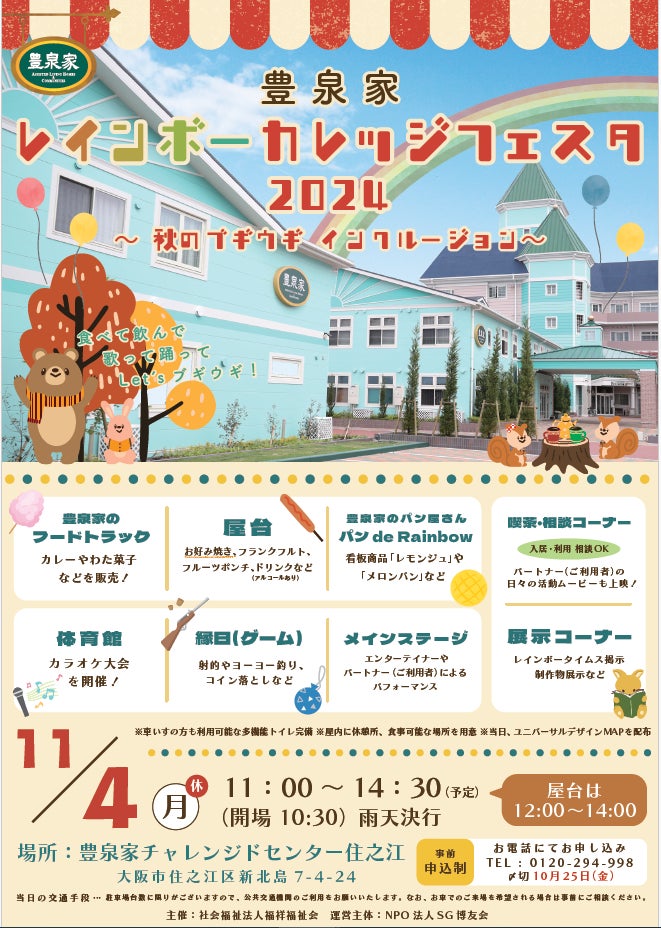 11月4日(月) 大阪市 住之江区「豊泉家チャレンジドセンター住之江」にて、障がいを有する方にも思い切りお祭りを愉しんでほしい!という想いで「豊泉家レインボーカレッジフェスタ2024」を開催致します。