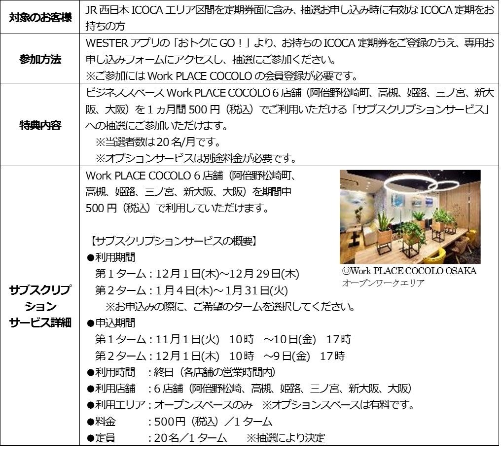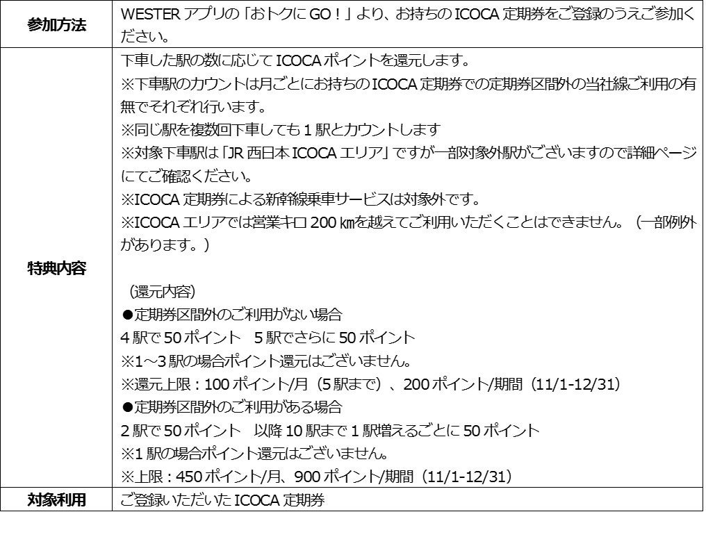 ICOCA定期券をお持ちのお客様はJR西日本だけではなくJR西日本グループ全体にとって非常に大切なお客様であり、当社グループの一層のファンになっていただけるようファンクラブ会員証として特典をプラスしました。WESTERアプリ・WESPOアプリにICOCA定期券をご登録いただくことで、さらにおトクにJR西日本グループサービスをご利用いただけますので是非ご参加ください。
