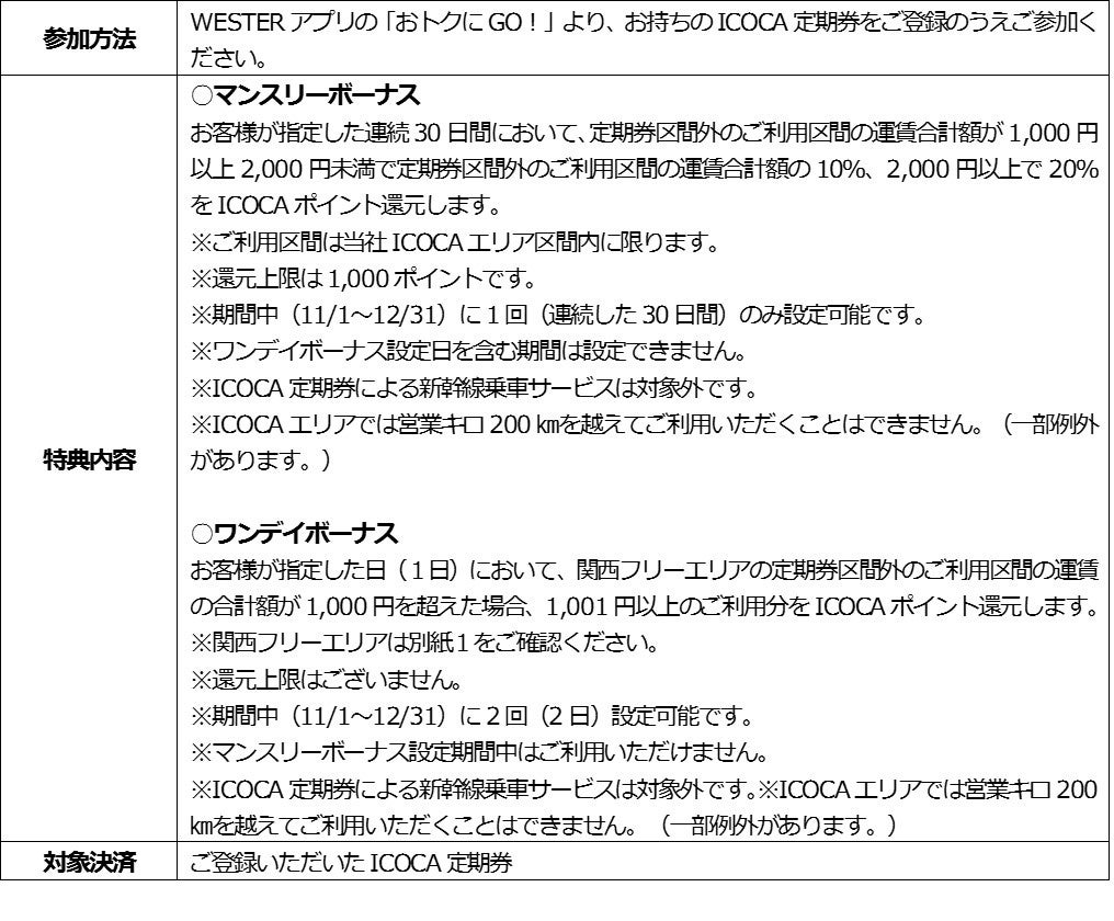 2022年11月1日(火)~12月31日(土)において、JR 西日本を通勤・通学などで日々ご利用いただくお客様へ感謝の気持ちを込めて、ICOCA定期券をお持ちの方を対象に、株式会社ギックスと協業し、ギックスが提供する個客選択型スタンプラリー「マイグル」を活用した「ICOCAに+(イコカにプラス)」サービスを提供します。