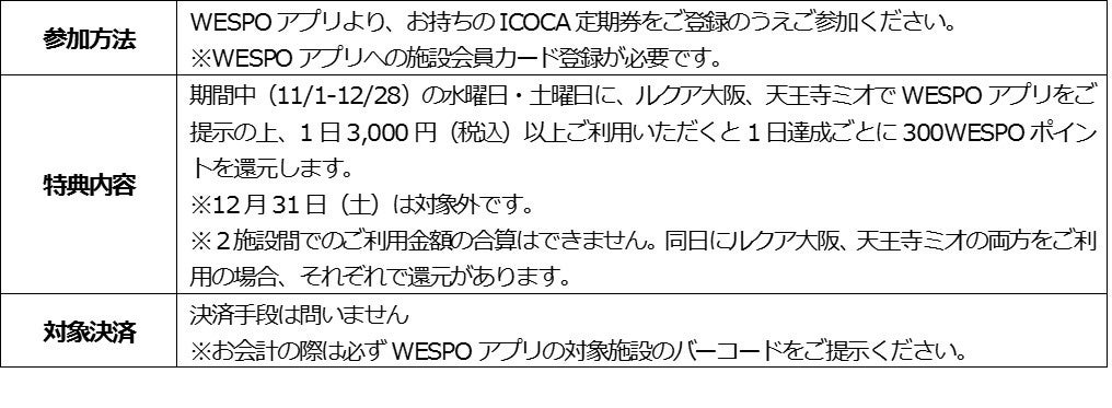 ・特典6のWESPOポイントの還元にはお会計までにWESPOへの施設会員カード登録とICOCA番号登録が必要です。