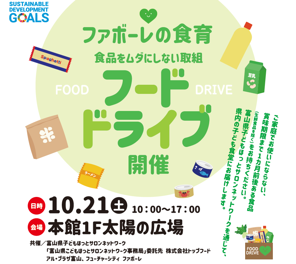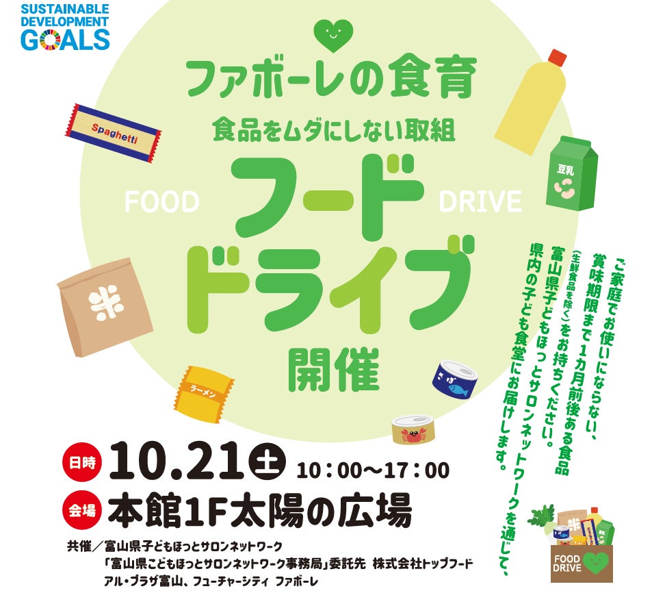 【富山フューチャー開発】10月21日(土) 10~17時 フューチャーシティ ファボーレにて、フードドライブを開催