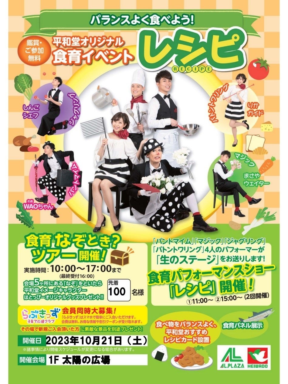 平和堂においても、食育活動に力を入れており、オリジナルコンテンツの『レシピ』を開催します。レシピはパントマイムなどのパフォーマンスを通じて食べることを楽しく学べるイベントです。平和堂各店にて展開しており、ファボーレでは3回目の開催となります。