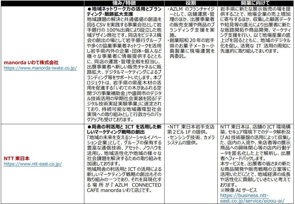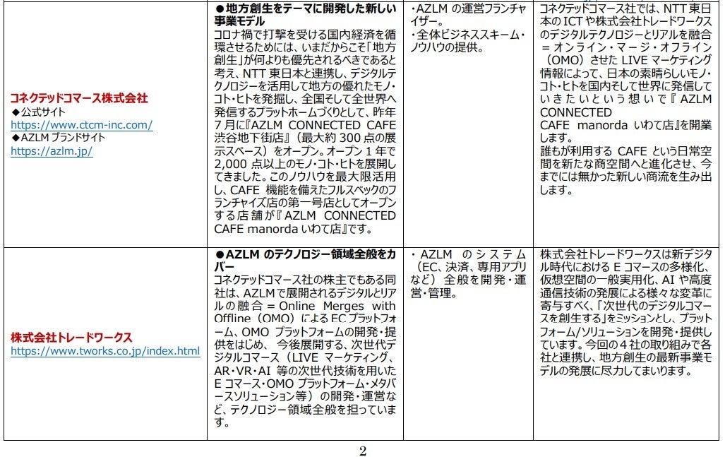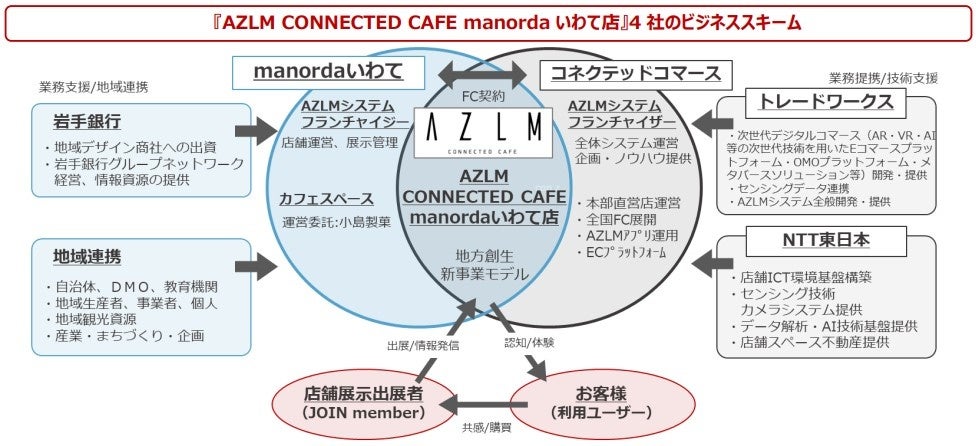 今回の取り組みは、manordaいわて株式会社による県内企業の事業機会やマーケティング機会の創出、NTT東日本のICTを活用したビジネス化と地域局舎の利活用等の地域課題に対して、株式会社トレードワークスがサポートするコネクテッドコマース社のデジタルとリアルを融合したAZLMシステムで解決する今までに無い新しい地方創生モデルです。そして、他地域でも展開可能な事業モデルです。