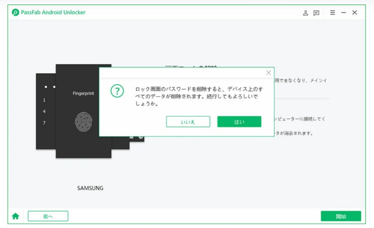 Step3:ポップアップで、「ロック画面のパスワードを削除すると、デバイス上のすべてのデータが削除されます。続行してもよいでしょうか」と表示されます。「はい」をクリックします。