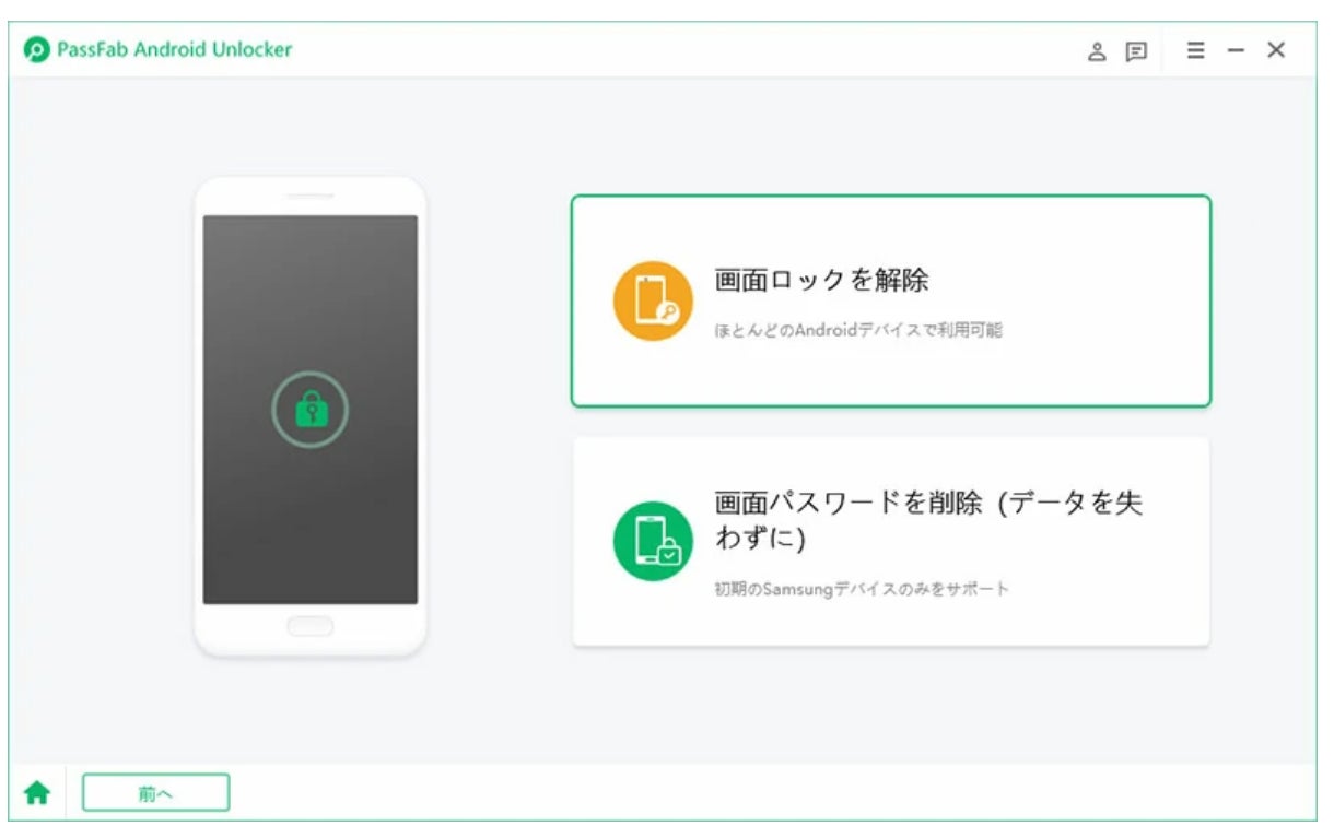 Step1:PassFab Android Unlockをパソコンにダウンロードして起動し、「画面ロックを解除」を選択します。